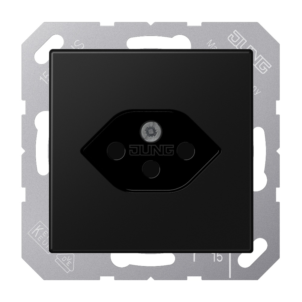 Jung Steckdose nach Schweizer Norm A1520-13SEVSWM Steckdose nach Schweizer Norm, 1fach, Typ 13, Serie A, graphitschwarz matt 10 A 250 V, L+N+PE mit Federklemmen für starre Leiter bis 2,5 mm2 nach SEV 1011-1998/IEC 884-1 Montage in Gerätedose nach EN 60670-1 nicht für Montage in Aufputz-Kappen geeignet (kpl. mit Tragring, Schraubbefestigung) Material: Thermoplast lackiert Hersteller Jung Schalterprogramm EAN Nr. 4011377205260 Warengruppe Jung Serie A