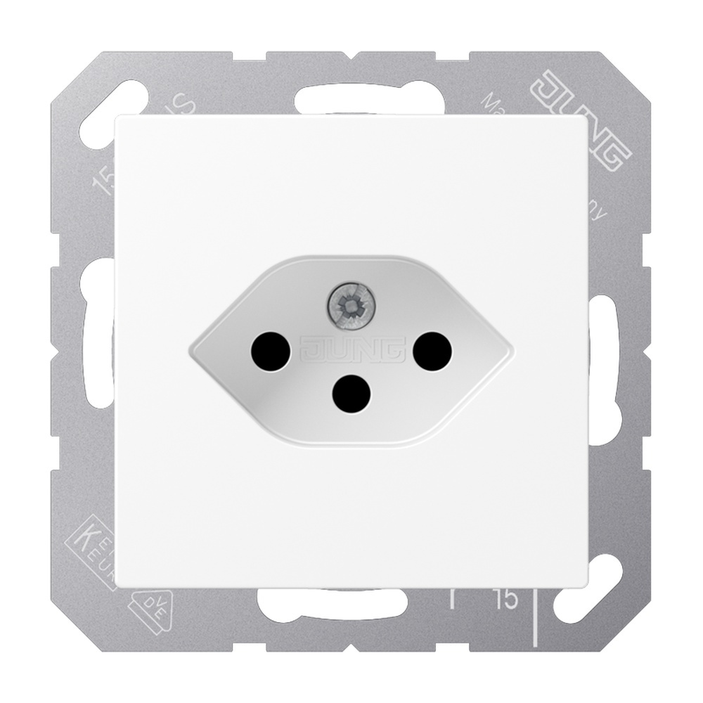 Jung Steckdose nach Schweizer Norm A1520-13SEVWWM Steckdose nach Schweizer Norm, 1fach, Typ 13, Serie A, schneeweiß matt 10 A 250 V, L+N+PE mit Federklemmen für starre Leiter bis 2,5 mm2 nach SEV 1011-1998/IEC 884-1 Montage in Gerätedose nach EN 60670-1 nicht für Montage in Aufputz-Kappen geeignet (kpl. mit Tragring, Schraubbefestigung) Material: Thermoplast lackiert Hersteller Jung Schalterprogramm EAN Nr. 4011377203778 Warengruppe Jung Serie A