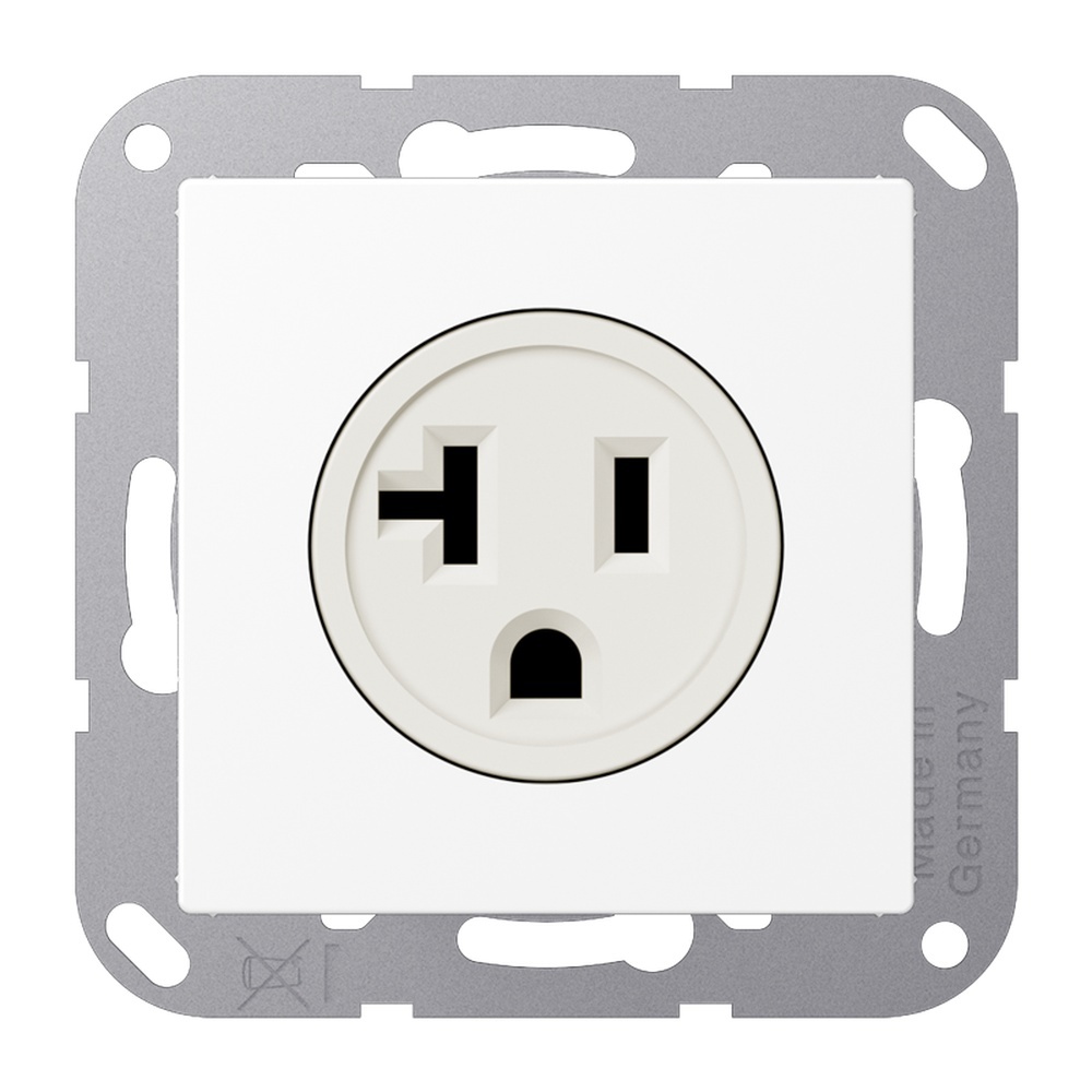 Jung Steckdose US Norm NEMA A521-20WWM Steckdose US-Norm NEMA, 20 A 125 V, Schraubklemmen, ohne Krallen, Thermoplast lackiert, Serie A, schneeweiß matt 20 A, 125 V, 5-20R, 2-pol.+E mit Schraubklemmen für starre und flexible Leiter bis 4 mm2 nach US-NEMA Material: Thermoplast lackiert Hersteller Jung Schalterprogramm EAN Nr. 4011377203723 Warengruppe Jung Serie A