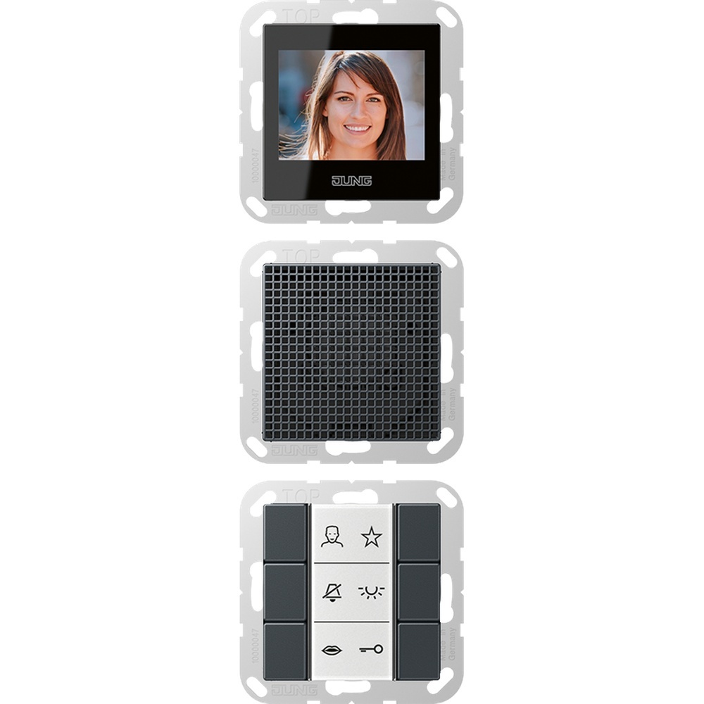 Jung Video Innenstation SI VI A 622 ANM Video-Innenstation, mit Beschriftungsfeld, Beschriftungsfolien mit Symbolen für Audio und Video, Tastensatz und Anschlusskabel Video schwarz, 220 mm, ohne Rahmen, für die Serien AS und A, TFT-Farbmonitor, 320 x 240 Pixel, Bildschirmdiagonale 55 mm 2,2 Zoll, Helligkeit und Farbe einstellbar, Bildaufschaltung, Sprechentaste mit grüner Status-LED, Licht-, Rufabschalt- und die beiden Funktionstasten frei konfigurierbar, Funktion der Tasten ohne Zusatzinstallation über Bus-Adern auslösbar, z. B. für Interntelefonie, Auslösung von Schalt-/Steuerfunktionen in Verbindung mit Siedle Bus-Schaltmodul BSM/BSE 650-.., gezielte Anwahl von Türlautsprechern, auf die Türöffnertaste kann eine Schaltfunktion in Verbindung mit Siedle Bus-Schaltmodul BSM/BSE 650-.. per BPS konfiguriert werden, Mithör- und Mitsehsperre integriert, Parallelschaltung gleichzeitiges Rufen von maximal Video-Innenstationen ab dem 3. Gerät ist die Siedle BPS zur Programmierung erforderlich, Tür-/Videoaufschaltung Sprech-/Videoverbindung jederzeit, auch ohne erfolgten Türruf, Elektret-Kondensatormikrofon, Anschluss für Siedle In-Home-Bus, Anschluss für Etagenruftaster, Rufgenerator mit 11 Ruftonfolgen einschließlich Gong, Ruflautstärke in 5 Stufen bis zu 92 dB A einstellbar, Sprachlautstärke in 5 Stufen einstellbar, Programmierung manuell, Plug+Play und über Siedle Bus-Programmier-Software BPS, nach Siedle Systemhandbuch, Innenstation mit Freisprechen, Statusanzeige bei aktiver Sprechverbindung, Rufabschaltung mit Statusanzeige, Rufunterscheidung für Etagenruf, 2 Türrufe und Internruf, Türöffner-/Lichtfunktion jederzeit über Busleitung, Türrufübernahme, Gruppenbildung für Türrufe jede Innenstation kann bis zu 4 Gruppen am selben Strang angehören, Intercom-Funktionen Rufweiterleitung, interner Gruppenruf, Sammeldurchsage, automatische Gesprächsannahme bei Internruf und Türmatik, verpolungssichere 2-Draht-Installation, 2-polige Zusatzversorgung notwendig J-Y St Y 2 x 2 x 0,8, mit Mehrfachrahmen waagerecht oder senkrecht kombinierbar, abgesetzte Montage in separaten Rahmen und Montage in Aufputz-Kappen möglich, zum Rufen, Sprechen, Türöffnen, Licht, Etagenruf, Schalt-/Steuerfunktionen und zur interne Kommunikation Hersteller Albrecht Jung GmbH & Co. KG Typ SIVIA622ANM EAN Nr. 4011377142688 Warengruppe Jung Türkommunikation