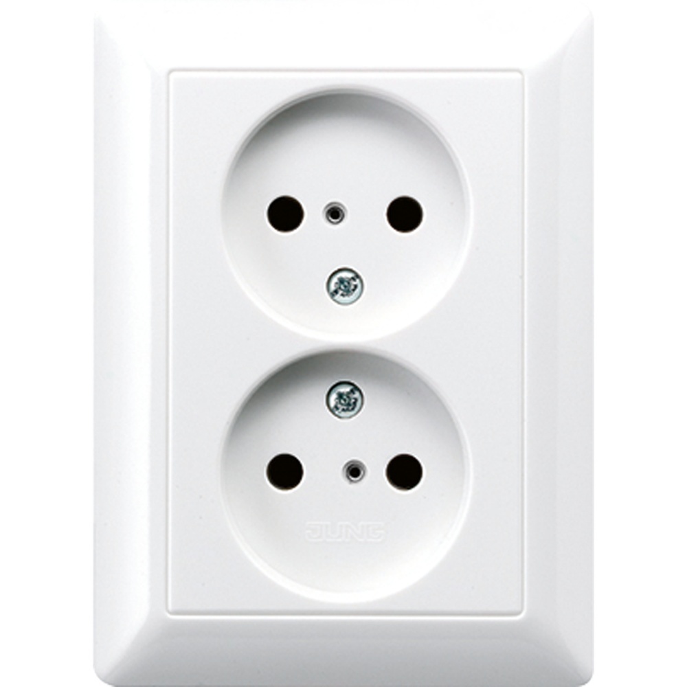 Jung Zweifach Steckdose AS5010KIUWW Zweifach-Steckdose ohne Schutzkontakt, 16 A 250 V ~, mit Berührungsschutz, Duroplast, Serie AS, alpinweiß mit integriertem erhöhten Berührungsschutzfür eine 60er Gerätedosemit integriertem Rahmenmit Federklemmen für starre Leiter bis 2,5 mm2Verbindungsklemmen nach DIN VDE 0620Maße: 80,5 x 105 mmMaterial: Duroplast Hersteller Jung Nr. AS5010KIUWW EAN Nr. 4011377330757 Warengruppe Jung Serie AS