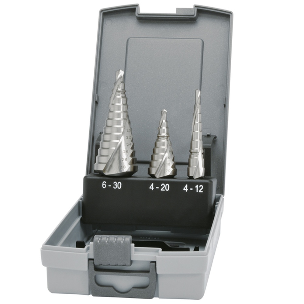 Klauke Stufenbohrersatz 50069900 Stufenbohrersatz Kwik Stepper™ Höhere Standzeiten. Geringer Kraftaufwand. Bessere Schneidleistung. Ruhigeres Arbeiten. Geringere Gratbildung, Bohrbereich von 4-30 mm. Zum Aufreiben von Blechen, Rohren, NE Metallen und Kunststoff, Kwik Stepper™ Stufenbohrersatz in Stahlblechkassette. Nr. 50069900 EAN Nr. 4012078445498 Warengruppe Klauke Stufenbohrer