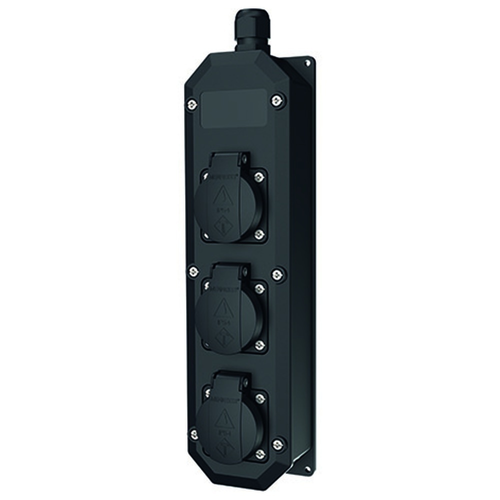 Mennekes Steckdosenleiste 9203230 Steckdosenleiste, IP44 anschlussfertig verdrahtet Schutzart IP 44 Spritzwasserschutz nur bei senkrechter Gebrauchslage ,Wandmontage, sichergestellt. Bei abweichender Gebrauchslage vor Spritzwasser und Regen schuetzen Gehaeuse: 1 Polyamid-Gehaeuse 330x80mm schwarz RAL 9005 Bestueckung/Absicherung: 3 SCHUKO-Steckdosen 16A 2p+E 230V schwarz Leitungseinfuehrung/Anschlussmoeglichkeit: 1 M 20 oben mit Verschraubung 1 Aufhaengebuegel ,lose, mit innenliegender Zugentlastung Hersteller Mennekes EAN Nr. 4015394262039 Warengruppe Mennekes Zubehör
