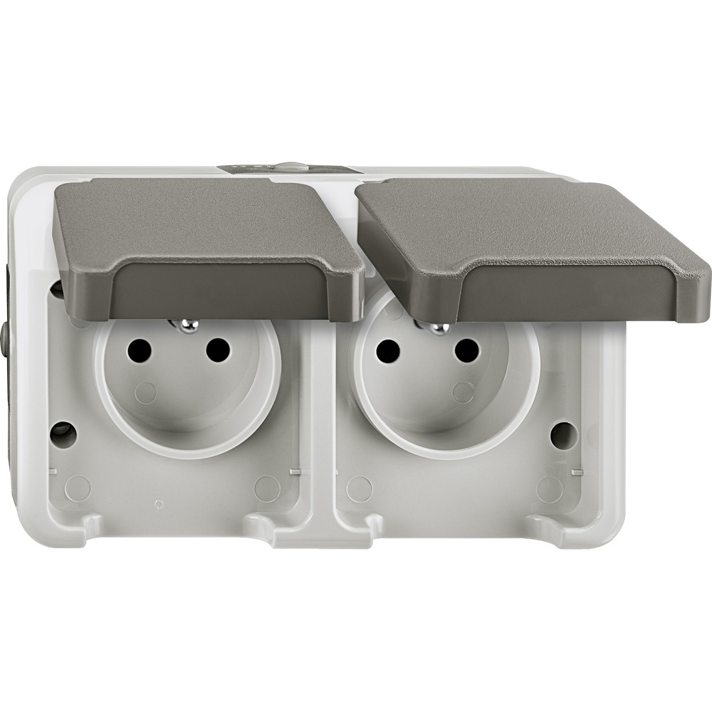 Merten Doppelsteckdose MEG2520-8029 Doppelsteckdose mit Schutzkontaktstift und BRS, lichtgrau, AQUASTAR Erhöhter Berührungsschutz. Waagerecht angeordnet und miteinander verdrahtet. Beschriftbar mit Schriftfeld-Einsatz. Aufputz-Montage. Mit Steckklemmen. Schutzart: IP 44. Abmessungen: ca. 83x73x57 mm. Zubehör: Schriftfeld-Einsatz AQUASTAR MEG3952-8000. Doppeleinführung AQUASTAR MEG3961-80.. Verbindungsstück AQUASTAR MEG3963-80.. Rohreinführung AQUASTAR MEG3964-8029. Kanaleinführung AQUASTAR MEG3965-80.. Schieber mit Stutzen AQUASTAR MEG3962-8029. Farbe: lichtgrau. Typ MEG2520-8029 EAN Nr. 4042811179991 Warengruppe Merten AQUASTAR
