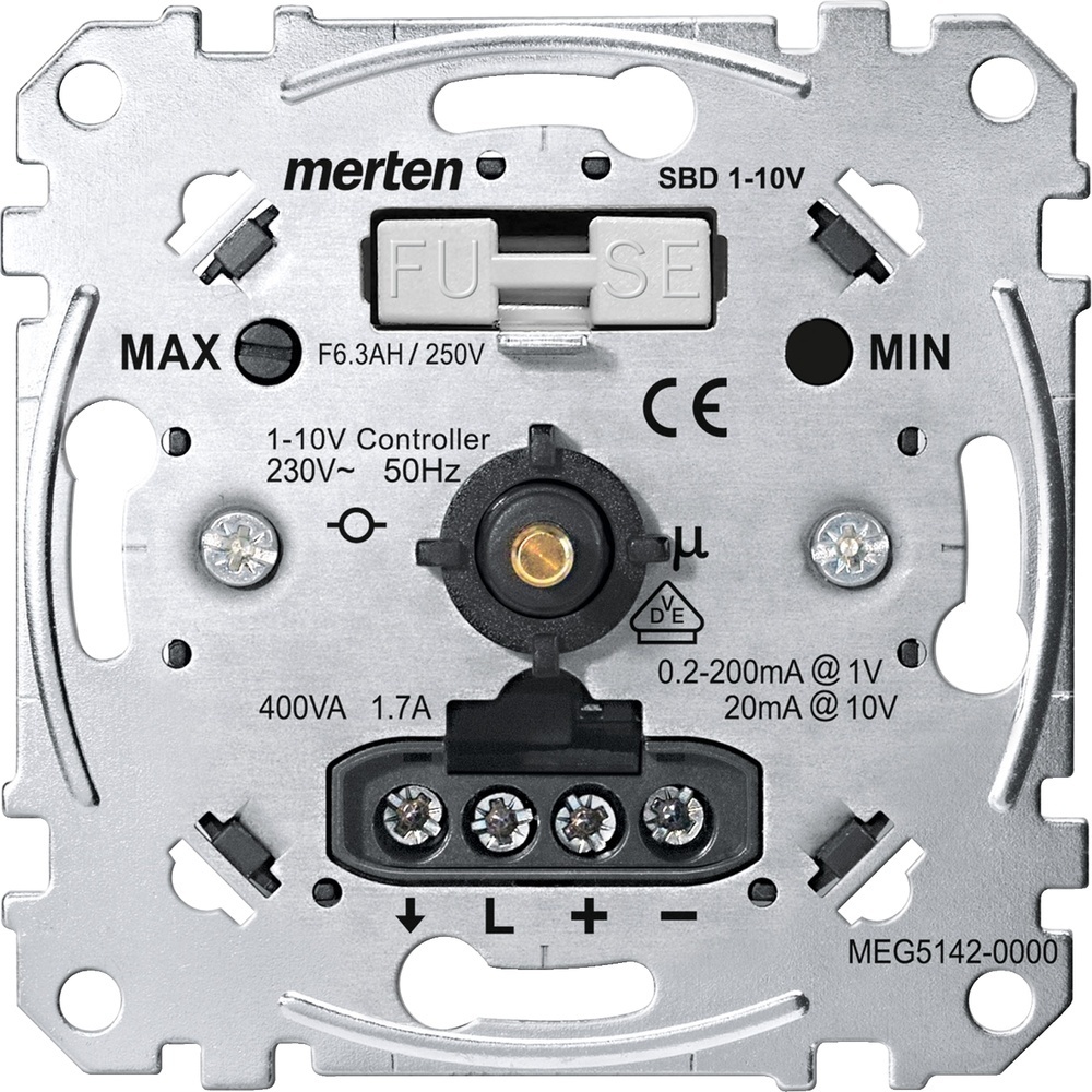 Merten Potentiometer MEG5142-0000 Elektronik-Potentiometer-Einsatz 1-10 V Für Leuchtstofflampen mit EVG, elektronischem Trafo mit 1-10 V Schnittstelle. Mit Druck-Ausschalter 1,7 A. Zu komplettieren mit: Zentralplatte mit Drehknopf System M MEG5250-03../-04../-06.., System Fläche MEG5250-40../-41../-42.. Typ MEG5142-0000 EAN Nr. 4042811155391 Warengruppe Merten Einsätze