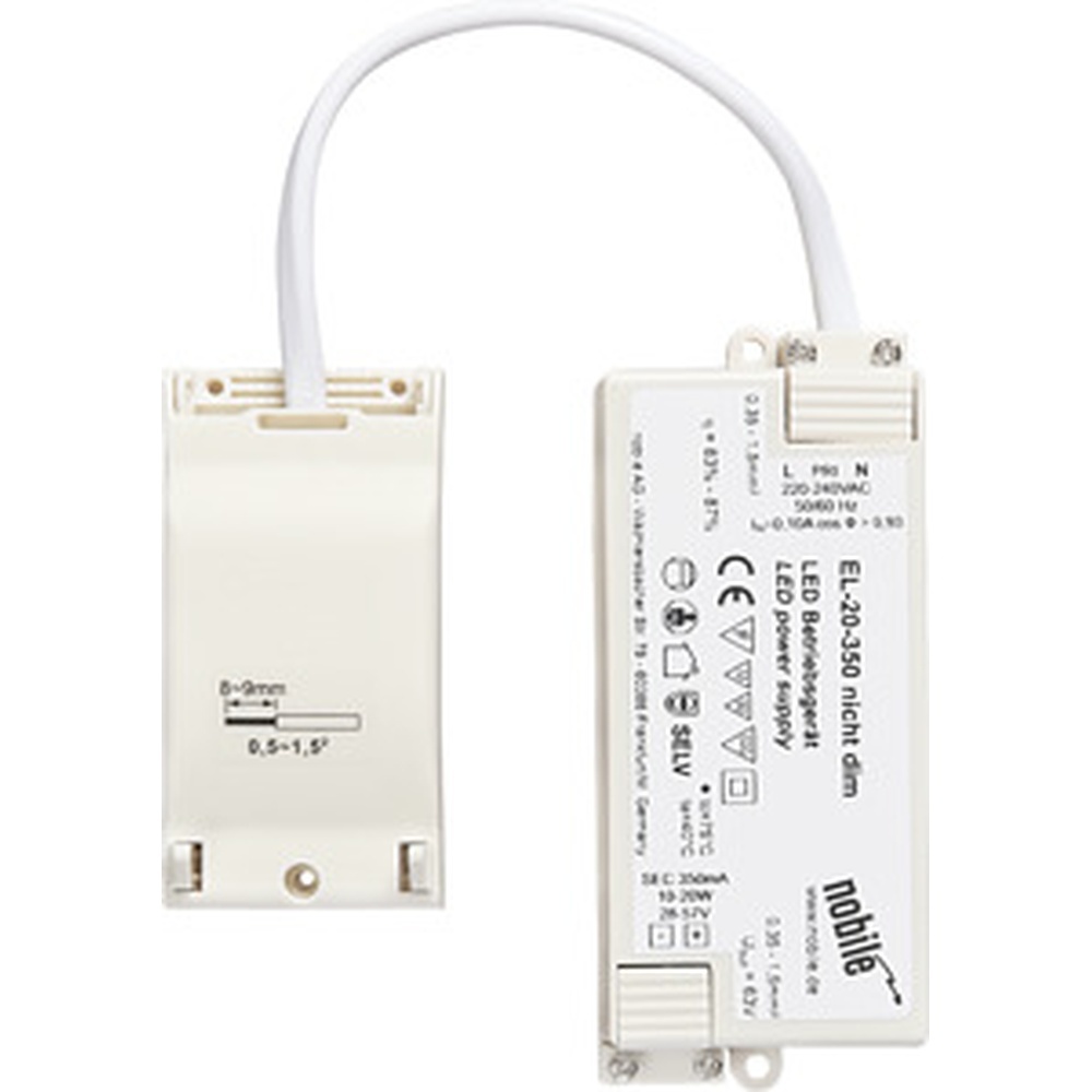 Nobile Betriebsgerät 8980202540 Typ EL-20-350 EL-20-350 nicht dim LED Betriebsgerät nur zum Einbau in die Zwischendecke. Anschlussart primär: Anschlussbox mit Durchgangsverdrahtung (L, N, PE), Steckklemmen Anschlussart sekundär: abgedeckte Klemmstellen (starr/flexible Leitungen Ø 0,5-1,5 mm²) Hersteller Nobile Leuchten EAN Nr. 4044538070353 Warengruppe Nobile Trafo