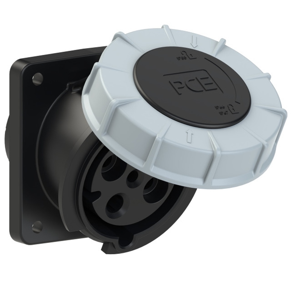 PC Electric Anbaudose 434-7fc Anbaudose schräg 63A 4p 7h IP66/67 Power Twist Flansch 100x107-Lochabstand 77x85, Rahmenklemme mit Schrauben, Gehäusematerial PA6, Kontakte Messing mit Lamellenkontakt CuBe Hersteller PC Electric ( PCE ) EAN Nr. 9003399219313 Warengruppe PC Electric Anbausteckdosen