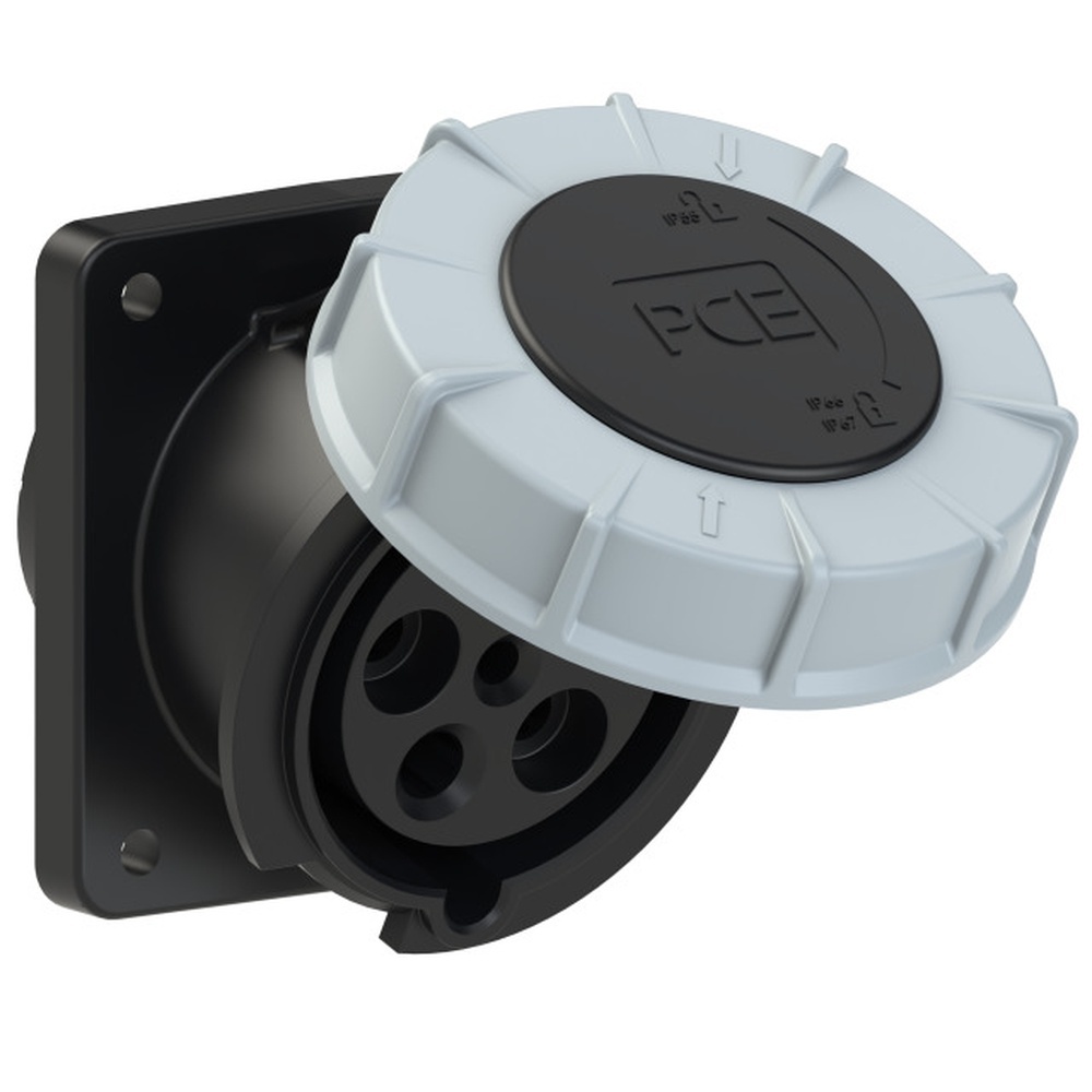 PC Electric Anbaudose 435-7fc Anbaudose schräg 63A 5p 7h IP66/67 Power Twist Flansch 100x107-Lochabstand 77x85, Rahmenklemme mit Schrauben, Gehäusematerial PA6, Kontakte Messing mit Lamellenkontakt CuBe Hersteller PC Electric ( PCE ) EAN Nr. 9003399217159 Warengruppe PC Electric Anbausteckdosen