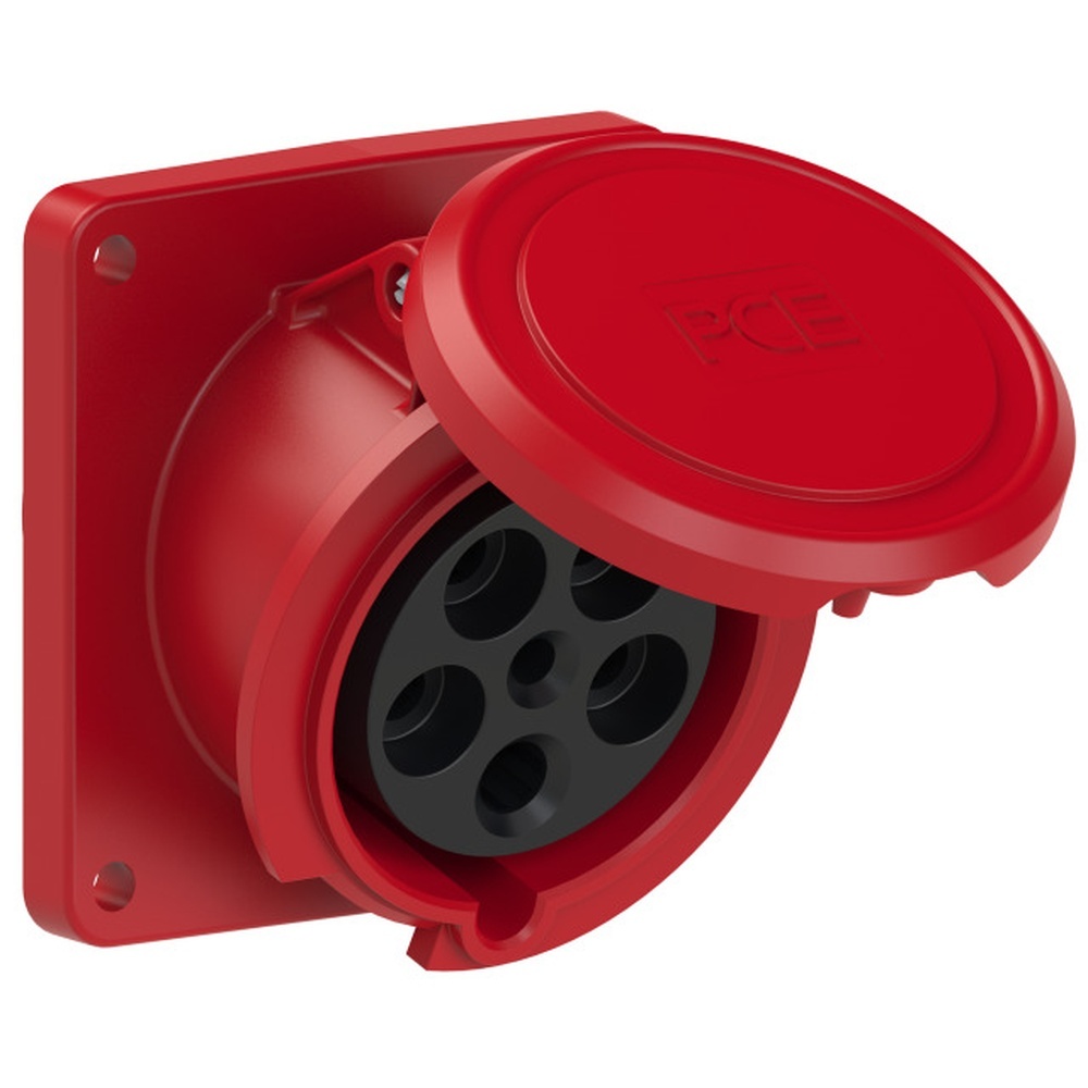 PC Electric Anbaudose 4351-6fd Anbaudose schräg 63A 5p 6h IP44 Power Twist Flansch 106x110-Lochabstand 90x90, Rahmenklemme mit Schrauben, Gehäusematerial PA6, Kontakte Messing mit Lamellenkontakt CuBe Hersteller PC Electric ( PCE ) EAN Nr. 9003399378027 Warengruppe PC Electric Anbausteckdosen
