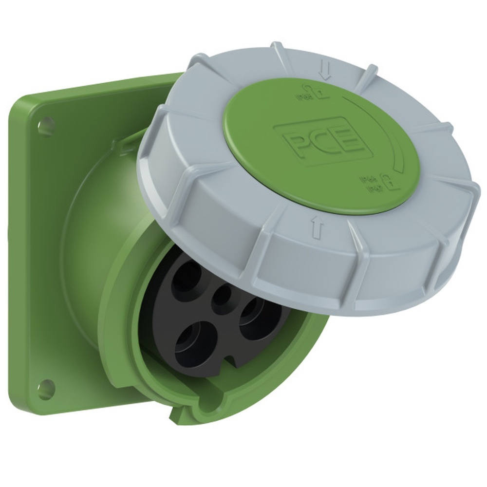 PC Electric Anbausteckdose 434-10fd Anbausteckdose schräg 63A 4p 10h IP66/67 Power Twist Flansch 106x100-Lochabstand 90x90, Rahmenklemme mit Schrauben, Gehäusematerial PA6, Kontakte Messing mit Lamellenkontakt CuBe Hersteller PC Electric ( PCE ) Warengruppe PC Electric Anbausteckdosen