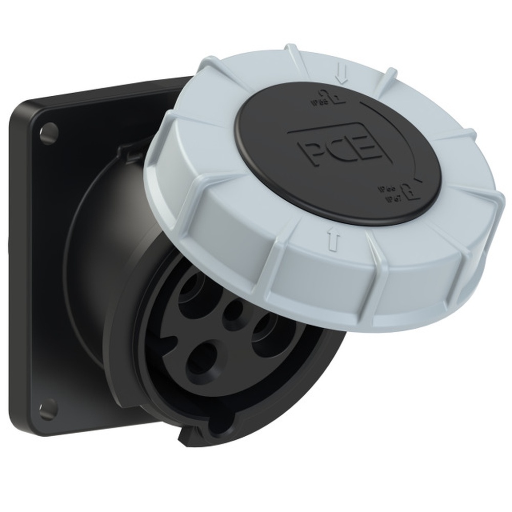 PC Electric Anbausteckdose 434-7fd Anbausteckdose schräg 63A 4p 7h IP66/67 Power Twist Flansch 106x100-Lochabstand 90x90, Rahmenklemme mit Schrauben, Gehäusematerial PA6, Kontakte Messing mit Lamellenkontakt CuBe Hersteller PC Electric ( PCE ) EAN Nr. 9003399656675 Warengruppe PC Electric Anbausteckdosen