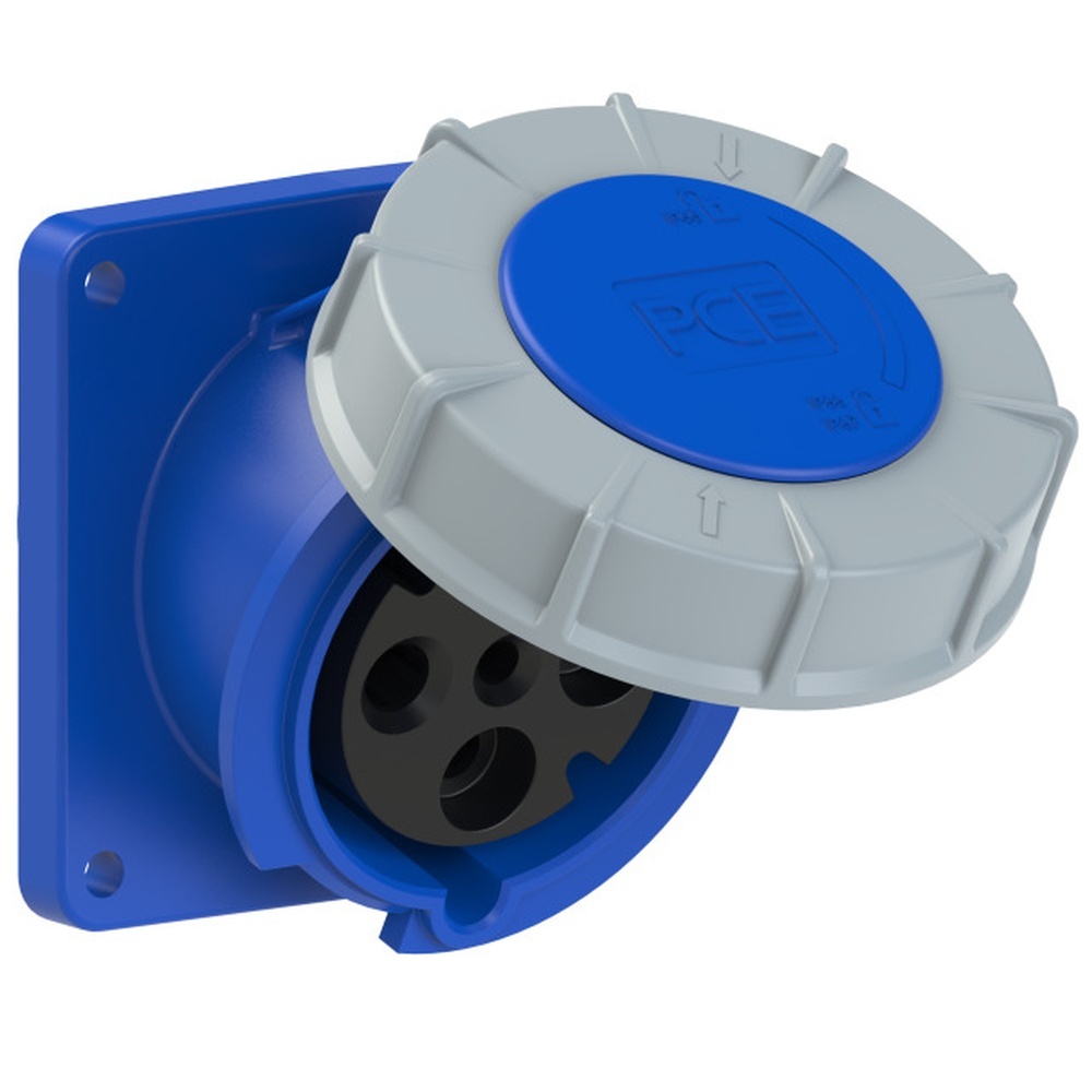PC Electric Anbausteckdose 434-9fd Anbausteckdose schräg 63A 4p 9h IP66/67 Power Twist Flansch 106x100-Lochabstand 90x90, Rahmenklemme mit Schrauben, Gehäusematerial PA6, Kontakte Messing mit Lamellenkontakt CuBe Hersteller PC Electric ( PCE ) EAN Nr. 9003399647949 Warengruppe PC Electric Anbausteckdosen