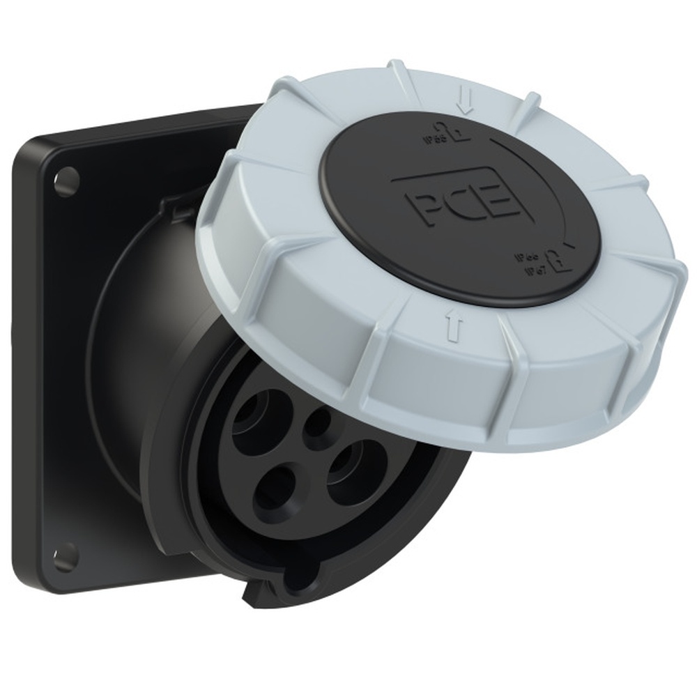 PC Electric Anbausteckdose 435-7fd Anbausteckdose schräg 63A 5p 7h IP66/67 Power Twist Flansch 106x100-Lochabstand 90x90, Rahmenklemme mit Schrauben, Gehäusematerial PA6, Kontakte Messing mit Lamellenkontakt CuBe Hersteller PC Electric ( PCE ) EAN Nr. 9003399711251 Warengruppe PC Electric Anbausteckdosen