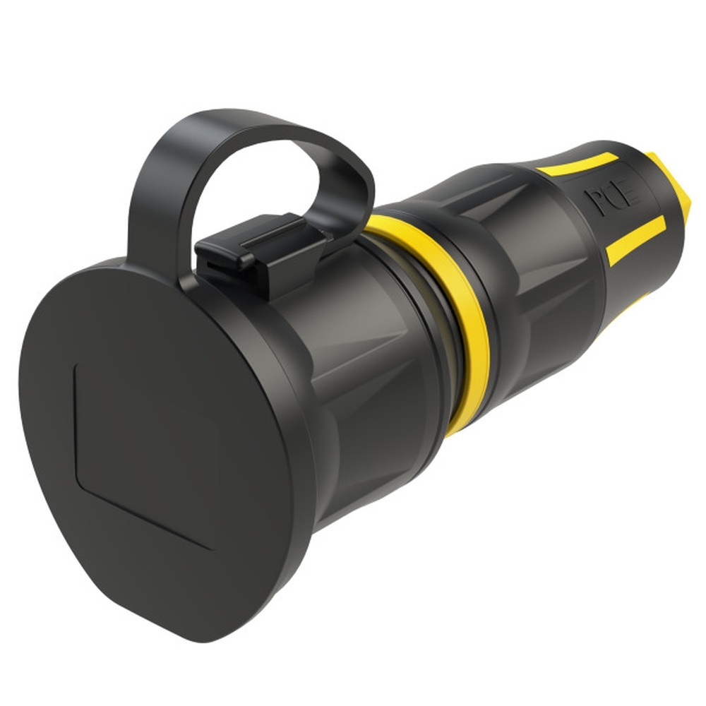 PCE Schutzkontaktkupplung 24711-sec Schutzkontaktkupplung DB fb SH IP54 gelb Serie TopTaurus2 Schutzkontaktkupplung Serie TopTaurus2 mit Deckelband, Farbe: schwarz-gelb, Material: PA6 2K gummiert, schraubenloses Schnellverschlusssystem für Gehäusehaube, Schutzkontaktsystem: franz./belg. mit Shutter, 16A/250V AC/3p (2P+E), Schutzart: IP54 Hersteller PCE Nr. 24711-sec EAN Nr. 9003399552632 Warengruppe PC Electric Kupplungen