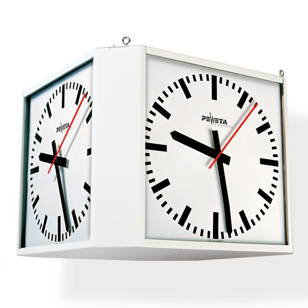 Peweta Nebenuhr 72.390.425 Stabiler vierseitiger Uhrenwürfel, Metallgehäuse weiß lackiert (RAL 9016), Kantenlänge ca. 565 mm. Abhängung von der Decke durch Ketten oder Seile (bauseitige Beschaffung oder im Lieferumfang enthalten, Option), 4 Ringösen am Uhrenwürfel sind vorhanden. 4 quadratischen Uhren ca. 425x425 mm, mit stoßgeschütztem Plexiglas, weiße Metallzifferblätter mit schwarzen DIN-Balkenziffern. Schwarze DIN-Balkenzeiger für Stunden- und Minutenanzeige bzw. rot für Sekundenanzeige. Hersteller Peweta Uhren Nr. 72390425 EAN Nr. 4250594514162 Warengruppe Peweta Nebenuhr
