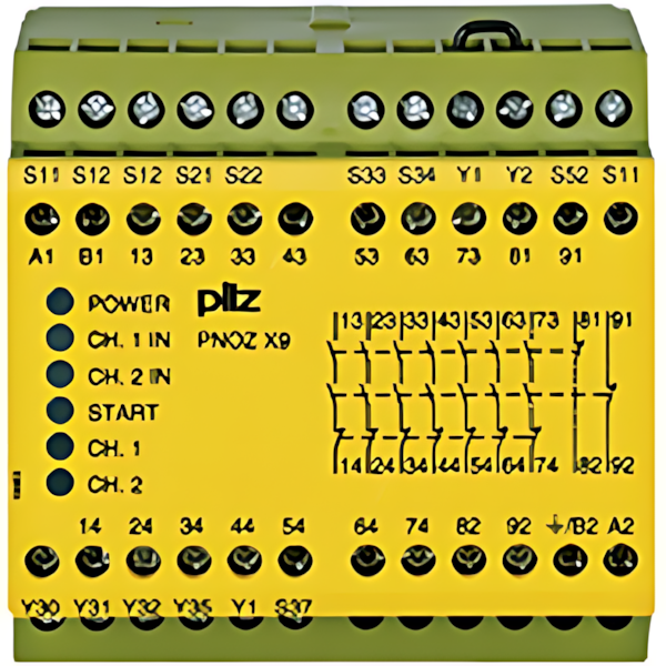 Pilz Sicherheitsschaltgerät 774605 Typ PNOZ X9 100-120VAC 24VDC 7n/o 2n/c 2so PNOZ X9 100-120VAC 24VDC 7n/o 2n/c 2so Sicherheitsschaltgerät (standalone), Eingänge: 1/2-kanalige Beschaltungmit Querschlusserkennung, Ausgänge: 7 S, 2 Ö, 2 HL,automatischer/überwachter Start, UB=24 V DC, Breite: 90 mm,Schraubklemmen integriert, Überwachung von Not-Halt, Schutztüren.Geeignet für Ansteuerung durch HL-Ausgänge. Hersteller Pilz Nr. 774605 Typ PNOZ X9 100-120VAC 24VDC 7n/o 2n/c 2so EAN Nr. 4046548010695 Warengruppe Pilz Sicherheitsschaltgeräte