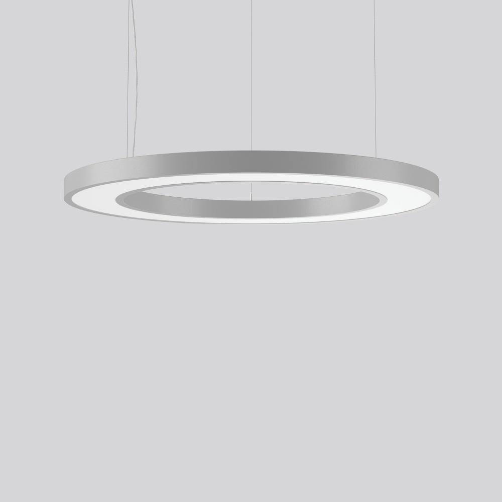 RZB Pendelleuchte 312556.004.1.76 TRIONA ring, 92 W, 12500 lm, 840, silber, DALI Pendelleuchten, D 1009 H 52, Kunststoff (PMMA) opal Dekorative ringförmige Pendelleuchte. Flacher nahtloser Rahmen Aluminium-Strangpressprofil pulverbeschichtet. Direkter Lichtaustritt über Diffusor Kunststoff opal. Indirekter Lichtaustritt über flächenbündigen Diffusor aus Kunststoff satiniert. Diffusor und Lightguide aus vergilbungsfreiem Kunststoff (PMMA). Seitliche Lichteinkopplung (RZB SIDELITE®-Technologie) für überdurchschnittlich homogene Leuchtdichteverteilung und randlose Ausleuchtung. Baldachin Stahlblech pulverbeschichtet mit Magnetbefestigung. Transparente Zuleitung 5 m (kürzbar). Seilabhängung 5 m (kürzbar) mit 3 Einzelseilen frei positionierbar. Montage an Schrägdecken mit einer Neigung bis 35° möglich. Schrägstellung der Leuchte bis 25° möglich. Lichtaustritt direkt/indirekt getrennt schalt- und regelbar. Hersteller RZB Nr. 312556.004.1.76 EAN Nr. 4051859582878 Warengruppe RZB Pendelleuchte