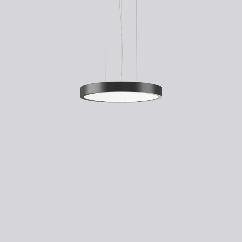 RZB Pendelleuchte Triona 312422.0031.2.730 Triona, 38 W, 2900 lm, 827-865, anthrazit, smart+free Pendelleuchten, D 461 H 52, 108 Grad, Kunststoff (PMMA) opal Dekorative runde LED Pendel-Flächenleuchte. Abdeckung Stahlblech pulverbeschichtet. Flacher nahtloser Rahmen Aluminium-Strangpressprofil pulverbeschichtet. Baldachin Aluminium pulverbeschichtet. Direkter Lichtaustritt über Diffusor aus Kunststoff opal. Indirekter Lichtaustritt über flächenbündigen Diffusor aus Kunststoff satiniert. Diffusor und Lightguide aus vergilbungsfreiem Kunststoff (PMMA). Seitliche Lichteinkopplung (RZB SIDELITE-Technologie) für überdurchschnittlich homogene Leuchtdichteverteilung und randlose Ausleuchtung. Lichtaustritt direkt 70%, indirekt 30%. Tunable White Versionen dynamisch einstellbar von 2700 K bis 6500 K. 3-Punkt Stahlseilabhängung stufenlos höhenverstellbar oder gewünschte Sonderlängen auf Anfrage. Betriebsgerät integriert. Mit smart+free Bluetooth Steuerung zur drahtlosen Vernetzung und Bedienung mittels Android/iOS Gerät, kostenlose App zum Download verfügbar. Hersteller RZB Leuchten EAN Nr. 4051859435556 Warengruppe RZB Pendelleuchte