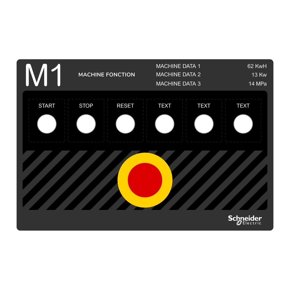 Schneider Electric Beschriftungsfeld ZBYLEG302001 Beschriftungsfeld 300x200mm, zum Aufkleben, Beschriftung vorgefertigt Beschriftungsfeld/Legendenfeld zum Aufkleben hinter die Befehls- und Meldegeräte wie z.B. Drucktaster, Leuchtmelder, Wahlschalter aber auch HMIs oder weitere Steuergeräte. Größe 300x200mm. Das Beschriftunsgfeld hat eine bereits vorgefertigte Beschriftung bzw. Layout. Mit der Kombination des Beschriftungsfeldes und den modernen Befehls- und Meldegeräten der Baureihe Harmony sorgt man für einen attraktiven, neuen Stil. Hersteller Schneider Electric Nr. ZBYLEG302001 EAN Nr. 3606489755744 Warengruppe Schneider Electric Befehls/Meldegeräte