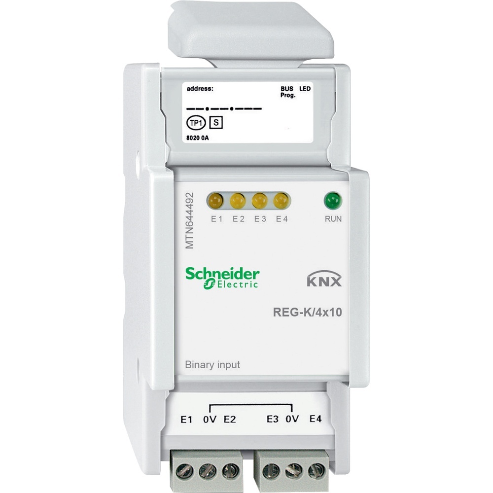 Schneider Electric Binäreingang MTN644492 Binäreingang REG-K/4x10, lichtgrau Schneider Electric KNX. Zum Anschluss von 4 konventionellen Tastern oder potentialfreien Kontakten an KNX. Erzeugt intern eine galvanisch vom Bus getrennte Signalspannung SELV. Mit integriertem Busankoppler und steckbaren Schraubklemmen. Je Eingang wird der Eingangsspannungspegel mit einer gelben LED angezeigt. Eine grüne LED zeigt nach dem Laden der Applikation die Betriebsbereitschaft an. Für die Montage auf Hutschienen TH35 nach EN 60715. Der Busanschluss erfolgt über eine Busanschlussklemme. Eingänge: 4. Kontaktspannung: max 10 V, getaktet, Kontaktstrom: max ca 2 mA, pulsförmig, Leitungslänge: max 50 m, Gerätebreite: 2,5 TE entspricht ca 45 mm, Lieferumfang: Mit Busanschlussklemme und Leitungsabdeckung. Hersteller Schneider Electric Nr. MTN644492 EAN Nr. 3606485099996 Warengruppe Schneider Electric Befehls/Meldegeräte