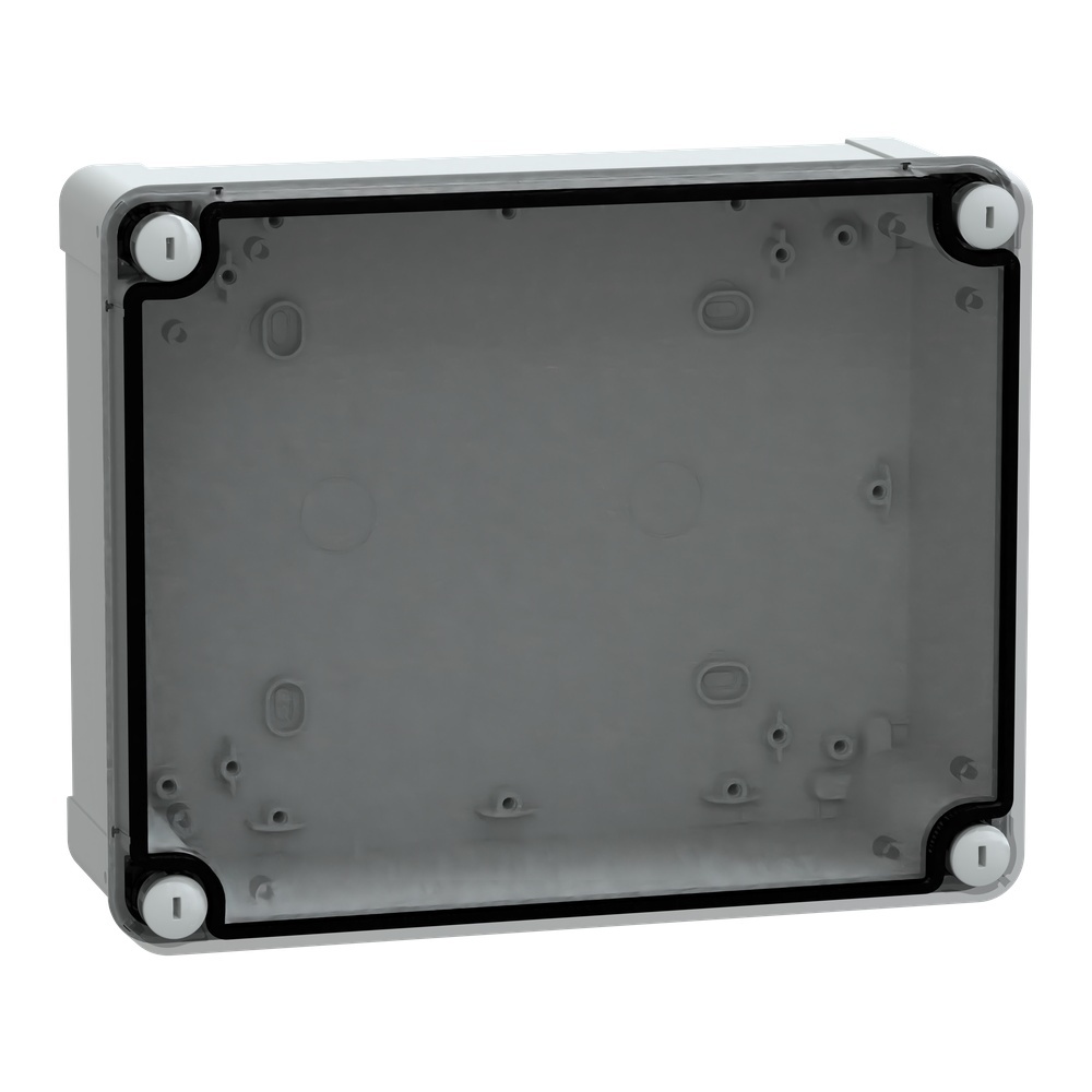 Schneider Electric Gehäuse NSYTBS24198T Thalassa TBS industrielle ABS-Box mit transparentem Deckel H20. Innenmaße 225x175x80 mm. Ext 241x194x87 mm. Wandmontagegehäuse mit flachem, transparentem Deckel. Schraubenverriegelung mit unverlierbaren Kunststoffschrauben (Schlitz). Zertifizierungen DEMKO, SEMKO, TÜV. Feuerbeständigkeit 650 Grad. ABS (Acrylnitril-Butadien-Styrol), Umgebungstemperatur für Lagerung/Betrieb (-15 bis 40 GradC)/(-25 bis 60 GradC). IP66 (NEMA 4.4X), IK07, Grau RAL 7035, Isolationsklasse II. Verpackungseinheit 2 Stk. Hersteller Schneider Electric GmbH Nr. NSYTBS24198T EAN Nr. 3606480165481 Warengruppe Schneider Electric Universalgehäuse