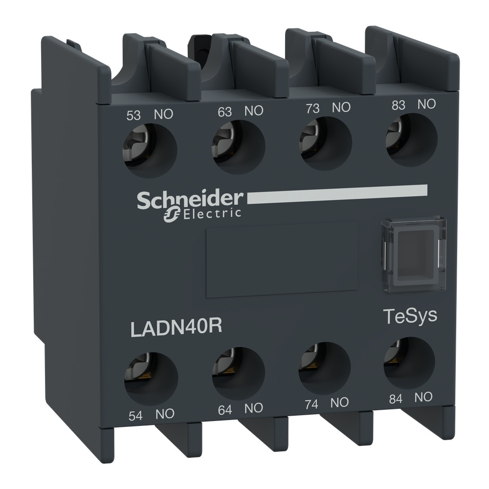 Schneider Electric Hilfskontaktblock LADN40R Hilfskontaktblock, TeSys Deca, 4NO, Schraubklemmen TeSys Deca Soforthilfskontaktblock, für Schütze LC1D, LC1F und Steuerrelais CAD. Er bietet 4NO-Kontakte mit einer Nennleistung von bis zu 10A/690V AC, Anschluss über Schraubklemmen. Clip-on-Frontmontage, sorgt für hohe Zuverlässigkeit und Langlebigkeit. Multi-Standard zertifiziert (IEC, UL, CSA, CCC, EAC), Green Premium konform (RoHS/REACh). Hersteller Schneider Electric Nr. LADN40R EAN Nr. 3606486040492 Warengruppe Schneider Electric Leistungsschalter