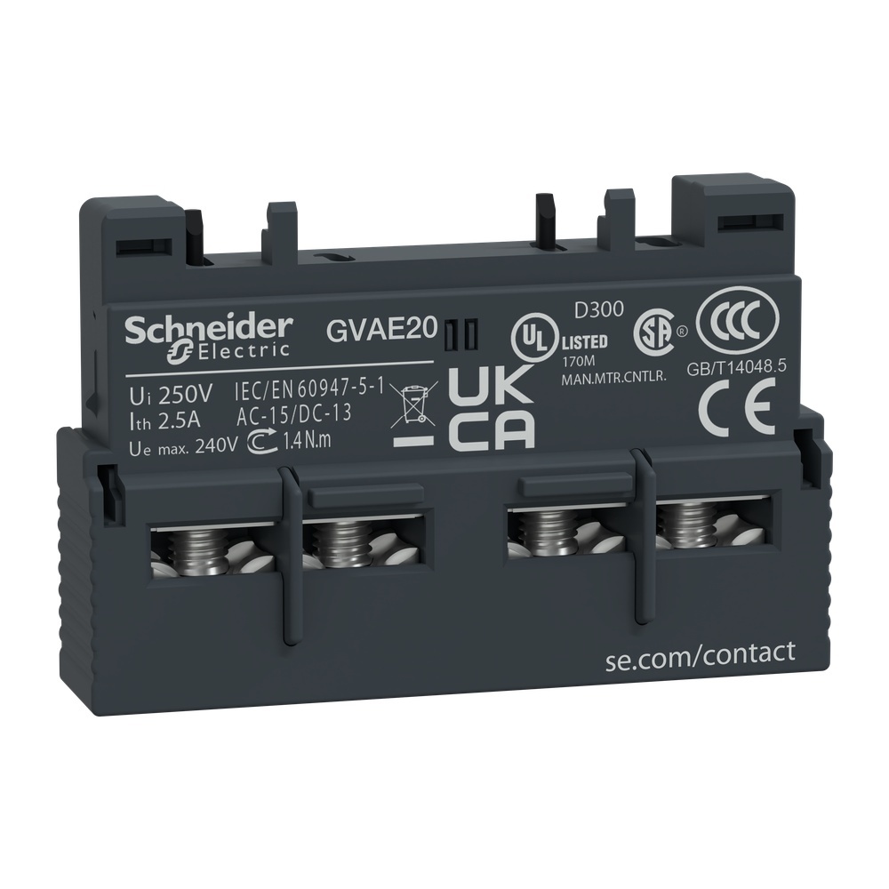 Schneider Electric Hilfsschalter GVAE20 TeSys Hilfsschalterblöcke für Motorschutzschalter GV2/3 von 0,1-65 A. Hilfsschalter. Anschluss Schraubklemmen, Anzahl_Max 1, Hilfsschalter 2S, Montage Frontseitig. Hersteller Schneider Electric GmbH Nr. GVAE20 EAN Nr. 3389110343465 Warengruppe Schneider Electric Motorschutzschalter