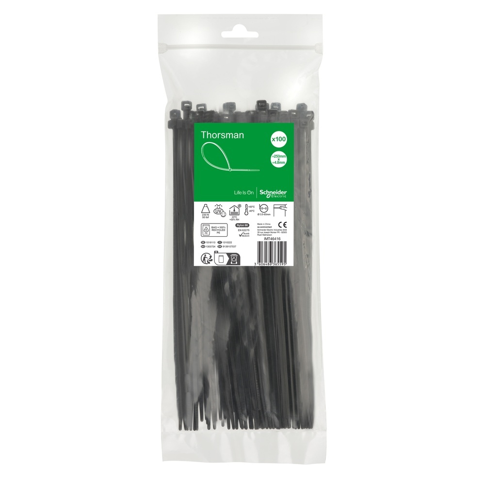 Schneider Electric Kabelbinder IMT46416 Kabelbinder Thorsman, Abmessung: 250X4,8 mm, VPE=100 Stück Farbe schwarz Thorsman-Kabelbinder von Schneider Electric ist 250x4,8 mm Kabelinstallationsmaterial. Kabelbinder werden für eine Vielzahl von Anwendungen verwendet, z.B. des Bündelns und Fixierens von Kabeln, Schläuchen und Schläuchen. Die Kabelbinder sind selbstsichernd. Die Kabelbinder haben glatte, abgerundete Kanten für eine einfache Handhabung und eine sicherere Installation. Die gebogene, abgerundete Spitze ermöglicht ein leichteres Einführen durch den Kopf des Kabelbinders. Der Bündeldurchmesser beträgt 3,5 mm bis 65 mm. Seine Schlaufenzugfestigkeit beträgt 230N/50lbf. Die Abmessungen des Produkts betragen (L) 250 mmx(B) 4,8 mmxDicke (T) 1,3 mm und das Produktgewicht beträgt 155g. Es besteht aus PA (Polyamid) 6.6 UV-stabilisiert. Die Farbe des Produkts ist schwarz. Die Umgebungslufttemperatur für den Betrieb liegt zwischen -40 GradC und +85 GradC. Die Verpackung besteht zu 100 % aus recycelbarem Material und die Produktmenge beträgt 100 Stück in einem wiederverschließbaren Beutel mit Reißverschluss. Thorsman-Kabelzubehör wie Stecker und Hohlraumbefestigungen, Schrauben und Kabelflügel sind alle so konzipiert, dass sie maximale Ergebnisse liefern. Das Thorsman-Sortiment an Kabelgarnituren und -befestigungen bietet ein breites Angebot für alle Arten von Kundenbedürfnissen und deckt eine maximale Anzahl von Anwendungen, Flexibilität, Zuverlässigkeit und Leistung ab. Das Produkt entspricht der Norm IEC 60695-11-5 und ist feuerbeständig und verfügt über die Flammschutznorm UL 94 V2 (selbstverlöschend). Hersteller Schneider Electric Nr. IMT46416 EAN Nr. 3606486365595 Warengruppe Schneider Electric Leitungsführungssysteme