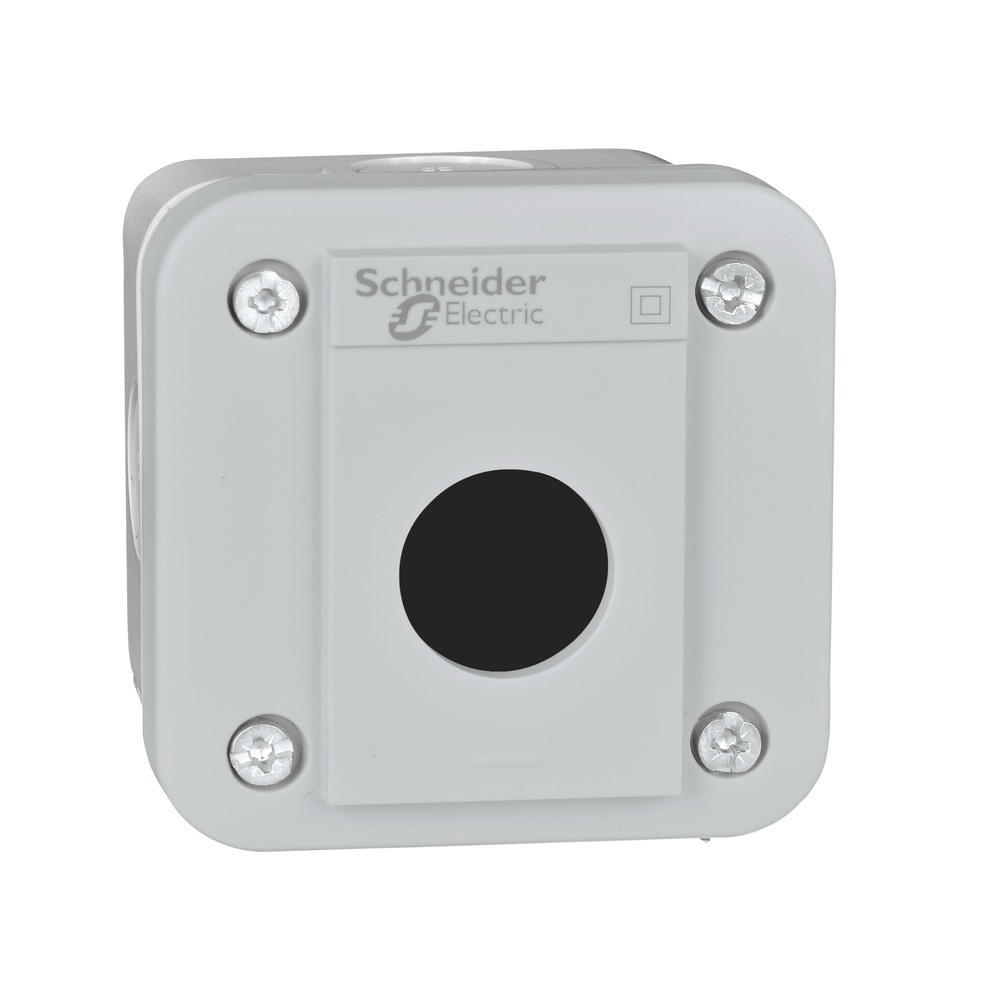 Schneider Electric Leergehäuse XALE1 Leeres Steuergehäuse mit hellgrauem Unterteil und Abdeckung. Es ist Teil der Baureihe Harmony XB7 mit einem Durchmesser von 22 mm in Monoblockausführung aus Kunststoff, Drucktaster und Leuchtmelder. Hersteller Schneider Electric GmbH Nr. XALE1 EAN Nr. 3389119017572 Warengruppe Schneider Electric Befehls/Meldegeräte