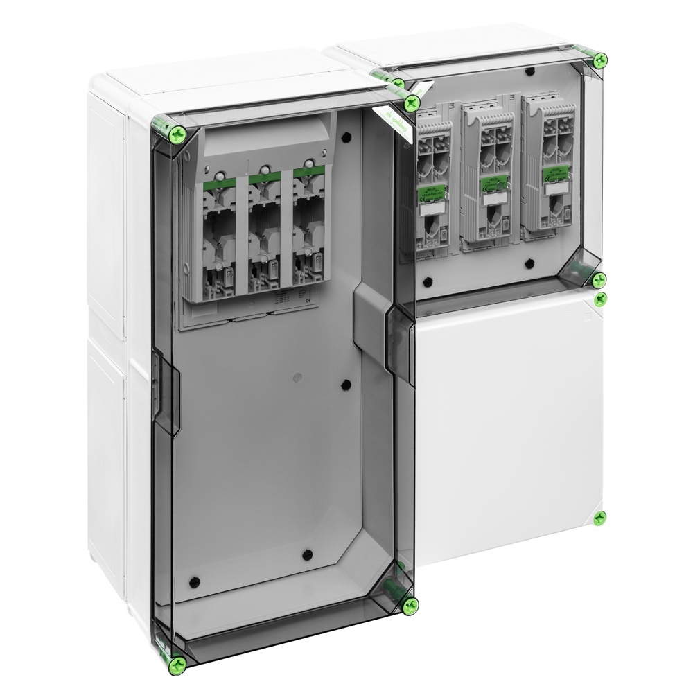 Spelsberg GTi Wechselrichtersammler 03361401 Typ GWS 7140 NH GTi Wechselrichtersammler, transparent, Schutzart IP65, Schlagfestigkeit IK08, Schutzklasse II, Bemessungsspannung 400V AC, halogenfrei Wechselrichter-Sammler für PV-Anlagen, geprüft nach EN 61439-2, Bemessungsleistung 140 kVA, Lieferung erfolgt in Baugruppen zur individuellen Anordnung vor Ort, einfache Kombination durch Stecksystem und beiligendes Zubehör, inkl. Flansche mit Vorprägungen zum Verschließen der Gehäuseseiten, individuell erweiterbar durch weitere GTi-Gehäuse NH1-Reiter-Sicherungs-Lasttrennschaltergehäuse GST 4116-250, NH000-Reiter-Sicherungs-Lasttrennschaltergehäuse GST 2335-250, Flanschen mit metrischen Vorprägungen, zum Anschluss von 3 Wechselrichtern (3-phasig) bis max. 140 kVA Gesamtleistung Abmessungen: 640x640x254mm Hersteller Spelsberg Nr. 03361401 Typ GWS 7140 NH EAN Nr. 4013902690787 Warengruppe Spelsberg NS Schaltanlagen