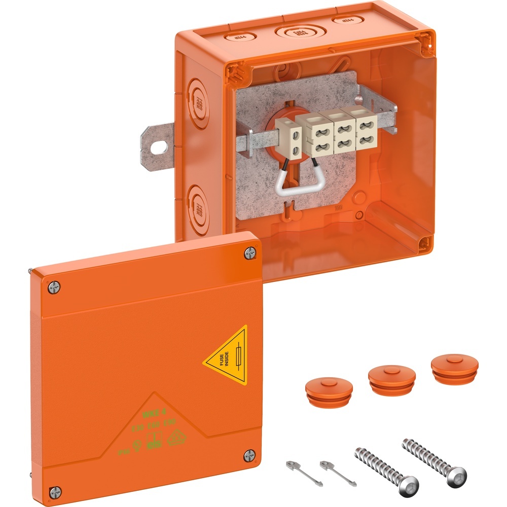 Spelsberg Kabelabzweigkasten 86911101 Typ WKE 4-3/3x6² 1SB Kabelabzweigkasten WKE 4-3/3x6² 1SB Kabelabzweig- und Verbindungskasten mit IP66 zertifiziert nach EN 61439 und IEC 62208 mit elektrischem Funktionserhalt E30-E90 nach DIN 4102 Teil 12. Halogenfreies Gehäuse aus Spezialthermoplast, Klemmen aus hochtemperaturbeständiger Spezialkeramik, Schnellmontage durch Außenbefestigungslaschen, Klemmenhalter frei positionierbar, Schutzart IP66, Funktionserhalt E30-E90, Nennquerschnitt 6², Schutzklasse II, Bemessungsisolationsspannung Ui 450V, Prüfzeichen VDE, Prüfzeichen UL-EU, halogenfrei, 150x150x85, Durchgangskasten 3 polig 0,5-6 mm², Abzweigkasten 3 polig 0,5-6 mm², Sicherung im Abzweig 1x2A (innenliegend, 1xWKE BS F2A, 86300101), Anzahl der klemmbaren Leiter pro Klemmstelle: 4x0,5²/2x0,75²/3x1²/3x1,5²/1x2,5²/1x4²/1x6², Beigefügtes Zubehör: Deckelverliersicherung, Schraubanker, 3 Doppelmembranstutzen M25 IP66 Dichtbereich 9-16 mm Hersteller Spelsberg EAN Nr. 4013902631452 Warengruppe Spelsberg Brandschutz
