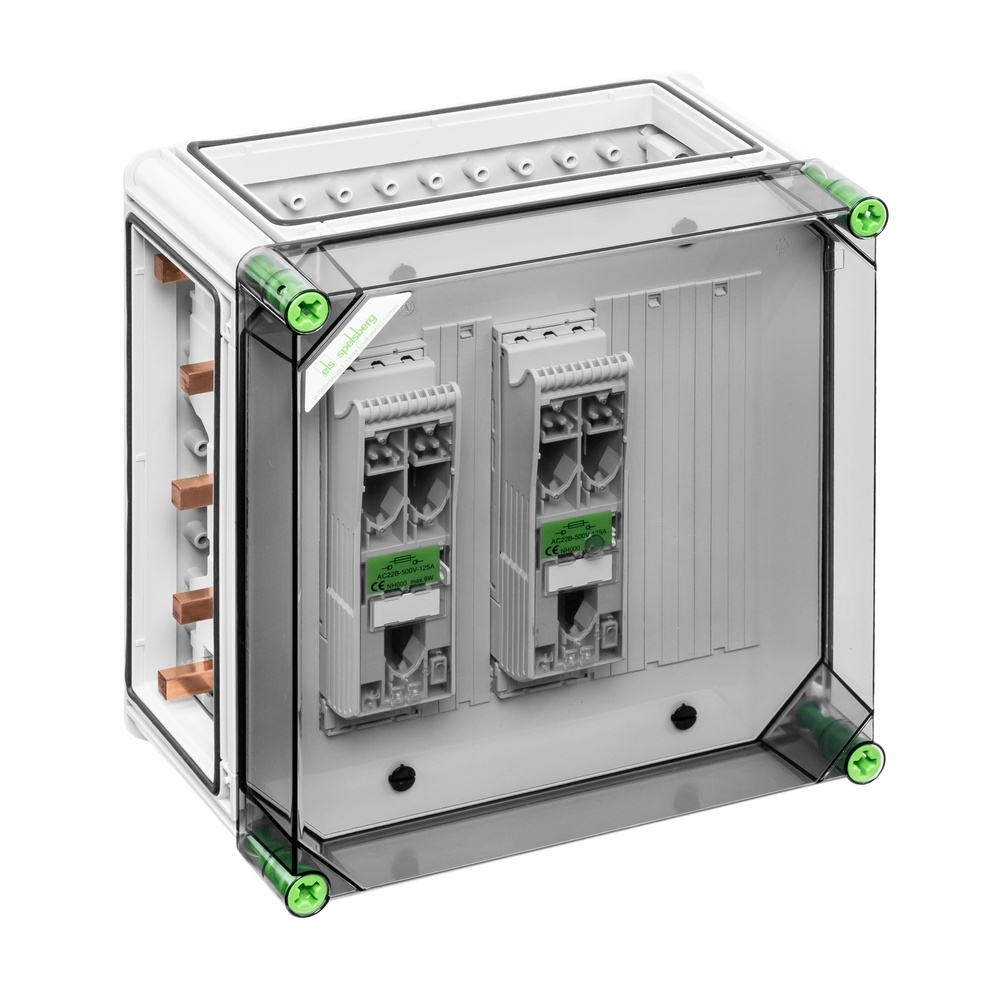 Spelsberg NH Reiterlasttrennergehäuse 04622586 Typ GST 2325-630 NH-Reiterlasttrennergehäuse, Schutzart IP65, Schlagfestigkeit IK08, Schutzklasse II, Bemessungsspannung 690V AC, halogenfrei NH-Reiter-Sicherungs-Lasttrennschaltergehäuse, 2xNH 000-Reiter-Sicherungs-Lasttrennschalter, Fahrstuhlklemme 1,5-50mm², Abgang unten, auf Sammelschiene 5-polig, mit 5 Sammelschienenklemmen zum direkten Anschluss eines Kabels an das Sammelschienensystem, zusätzliche N- und PE-Klemme für jeden Trennschalter, 3xGehäuseverbinder (GGV), Sammelschienensystem 630 A, mit transparentem Deckel Abmessungen: 320x320x179mm Hersteller Spelsberg Nr. 04622586 Typ GST 2325-630 EAN Nr. 4013902689231 Warengruppe Spelsberg NS Schaltanlagen