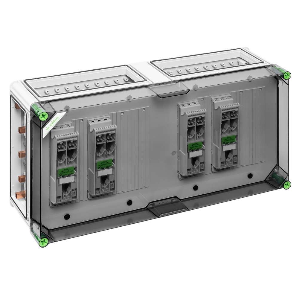 Spelsberg NH Reiterlasttrennergehäuse 04644586 Typ GST 4345-630 NH-Reiterlasttrennergehäuse, Schutzart IP65, Schlagfestigkeit IK08, Schutzklasse II, Bemessungsspannung 690V AC, halogenfrei NH-Reiter-Sicherungs-Lasttrennschaltergehäuse, 4x NH 000-Reiter-Sicherungs-Lasttrennschalter, Fahrstuhlklemme 1,5-50mm², Abgang unten, auf Sammelschiene 5-polig, mit 5 Sammelschienenklemmen zum direkten Anschluss eines Kabels an das Sammelschienensystem, zusätzliche N- und PE-Klemme für jeden Trennschalter, 4xGehäuseverbinder (GGV), Sammelschienensystem 630 A, mit transparentem Deckel Abmessungen: 640x320x179mm Hersteller Spelsberg Nr. 04644586 Typ GST 4345-630 EAN Nr. 4013902689422 Warengruppe Spelsberg NS Schaltanlagen