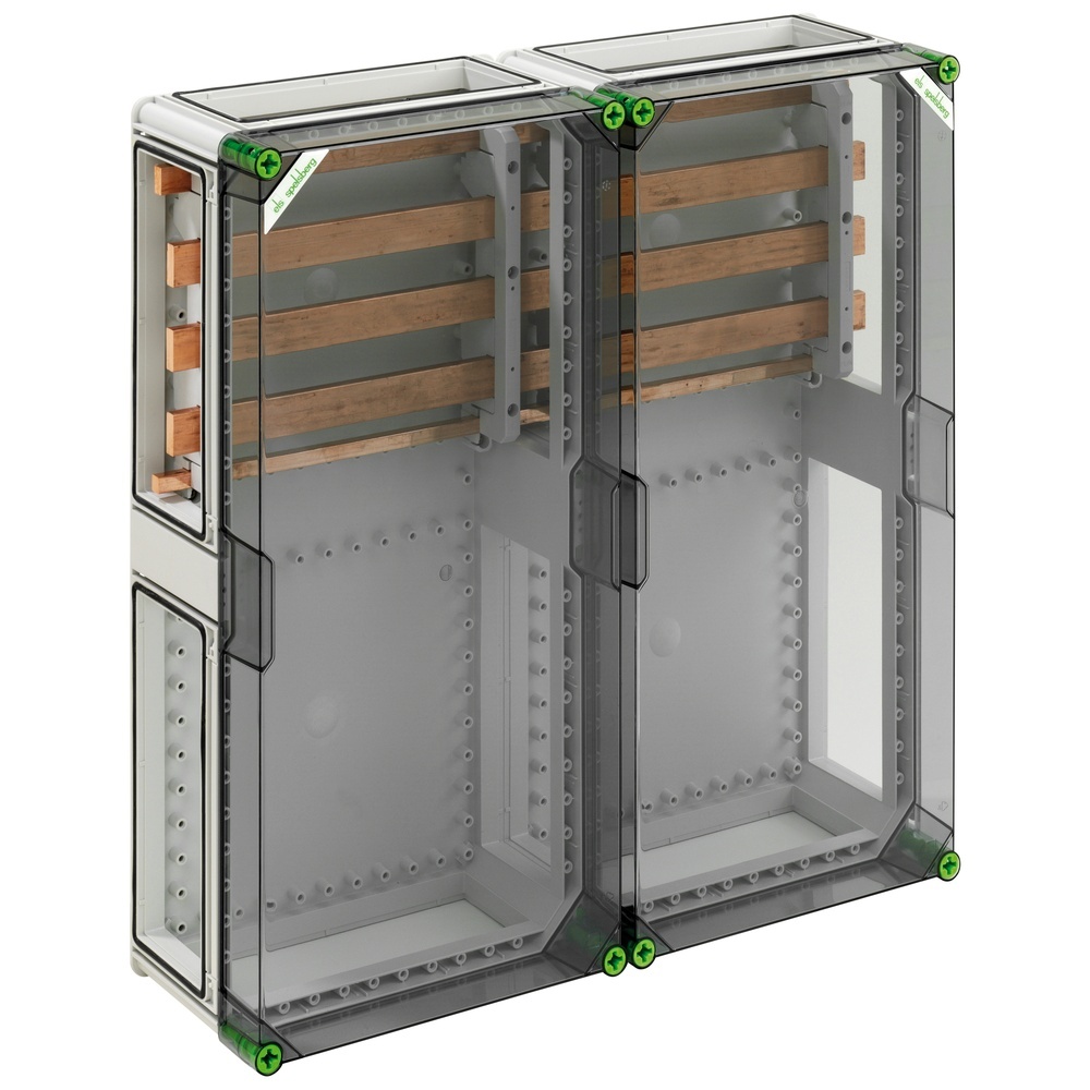Spelsberg Sammelschienengehäuse 04165601 Typ GSi 656 Sammelschienengehäuse GSi 656, Sammelschienengehäuse-Industrie Qualität -, 5-polig, 630A, mit Cu-Schienen, L1...L3: 30x10 mm, N: 25x10 mm, PE: 12x10 mm, ohne Klemmen, zur individuellen Bestückung, 4xGehäuseverbinder (GGV), Schutzart IP65, Schlagfestigkeit IK08, Schutzklasse II, Bemessungsisolationsspannung Ui 690VAC/DC, Halogenfrei, 640x640x179, mit transparentem Deckel EAN Nr. 4013902989614 Warengruppe Spelsberg NS Schaltanlagen