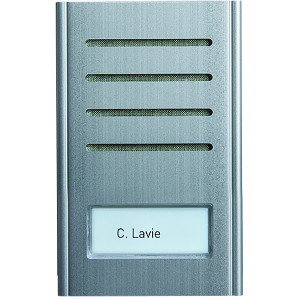 TCS Türstation Audio ASX13001-0010 Außenstation in kompakter Bauweise zur Aufputzmontage, Metallgehäuse aus robustem Aluminiumvollmaterial, Eloxiert Natur, Beleuchtete Kunststoff-klingelknöpfe mit intergriertem Namenschild, wartungsfreien Kontakten, langlebige und energiesparende Namensschildbeleuchtung, Quittungston beim Drücken der Klingeltaste, Gesprächszeit ab Werk: 56 Sekunden, Lautstärke und Mikrofonempfindlichkeit sind manuell einstellbar, R-Klemme nicht vorgesehen, Programmierkontakte ohne Geräteöffnung erreichbar, Türbereitschaftszeit (zur Steuerung der Kurzzeitspeicherung in Innenstationen), ab Werk: 56 Sekunden, Sprechverbindung nur möglich in der Türbereitschaftszeit, basiert auf dem TCS-BUS in 3-Draht-Technik, zulässige Umgebungstemperatur: -20 Grad C bis 50 Grad C, IP42, Gehäusemaß: H: 99mmxB: 50mmxT: 16mm Hersteller Typ ASX130010010 EAN Nr. 4035138029520 Warengruppe TCS Außenstation