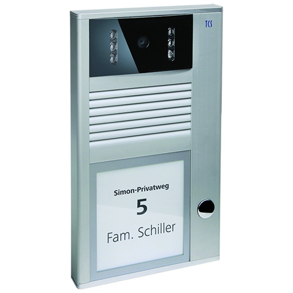 TCS Türstation Audio AVC11010-0010 Video Außenstation in kompakter Bauweise (Produkttiefe 16 mm), Aufputzmontage, win:clip Prinzip, Metallgehäuse aus robusten Aluminiumprofilen, Metallklingelknöpfe mit vergoldeten, wartungsfreien Kontakten, langlebige und energiesparende Namensschildbeleuchtung mit Lichtsensor, Quittungston beim Drücken der Klingeltaste, Gesprächszeit ab Werk: 56 Sekunden, Lautstärke und Mikrofonempfindlichkeit sind manuell einstellbar, R-Klemme zum Anschluss einer Funktionserweiterung Türöffnen, Türöffnerzeit an R-Klemme ab Werk 3 Sekunden, Türbereitschaftszeit (zur Steuerung der Kurzzeitspeicherung in Innenstationen), ab Werk: 56 Sekunden, Sprechverbindung in der Türbereitschaftszeit, Kamera: CCD-Sensor 380 TVL, Brennweite f = 3.6mm, Lichtempfindlichkeit 0.2 LUX, diagonaler Erfassungswinkel in 90 Grad, empfohlene Montagehöhe für die Kameraposition 1,6 m, Videoausgang symmetrisch 1 Vss FBAS, basiert auf dem TCS-Videosystem in 6-Draht-Technik, Eingangsstrom: I(a) = 0,4 mA, I(P) = 140 mA in Ruhe, maximaler Eingangsstrom: I(Pmax) = 156 mA, zulässige Umgebungstemperatur: -20 GradC bis 50 Grad C Hersteller Typ AVC110100010 EAN Nr. 4035138028424 Warengruppe TCS Außenstation