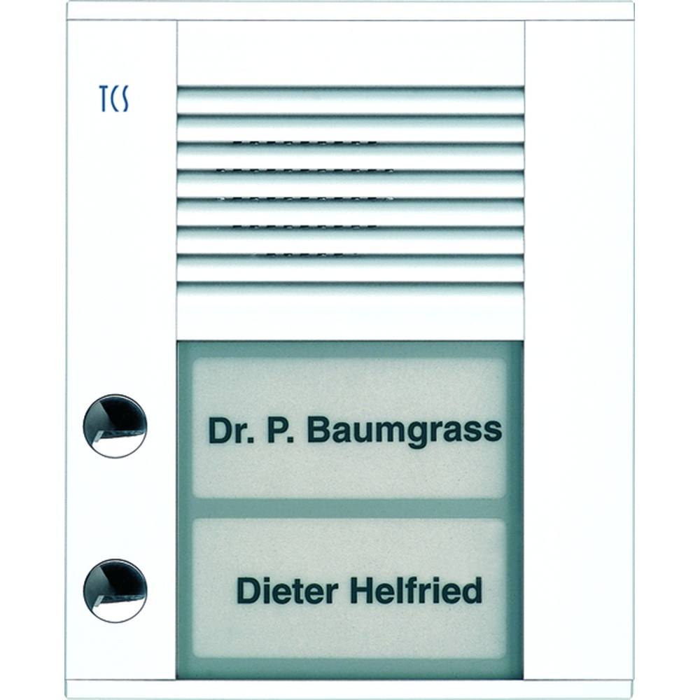 TCS Türstation Audio PDS02-WS/04 mit Mikrofon, Lautsprecher und Elektronik für einfachen Anschluss an den TCS:BUS, sehr gute Sprachqualität, Lautstärke und Mikrofonempfindlichkeit einstellbar, für den Anschluss weiterer Klingeltastenerweiterungen vorbereitet, integrierte Klingeltastenverdrahtung, Metallklingelknöpfe mit vergoldeten und wartungsfreien Tastenkontakten, langlebige Beleuchtung mittels Leuchtdioden, bruchsichere Namensschildabdeckung aus 5 mm dickem Kunststoffglas, Namensschildgröße 72x74 mm, beliebige Klingeltaste als Lichtschalttaste nutzbar, Lichtsymbol liegt bei, Kontrollton für den Besucher beim Drücken der Klingeltaste, sehr einfache Montage und Installation, Temperaturbereich: -20 GradC bis +50 GradC, Farbe: Aluminium weiß lackiert, Abmessungen: 166x135x20 mm Hersteller Typ PDS02WS04 EAN Nr. 4035138025584 Warengruppe TCS Außenstation