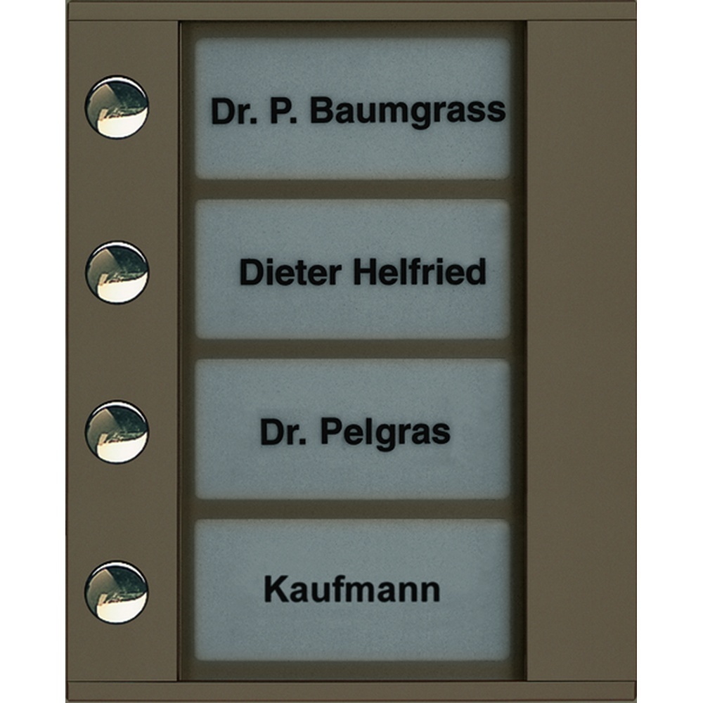 TCS Türstation Audio PDT04-EB/04 Integrierte Elektronik- und Klingeltastenverdrahtung, Anschluss über Verbindungsleitung an PDS-Außenstation, für den Anschluss ergänzender Klingeltastenerweiterungen vorbereitet, Namensschildgröße 74x34 mm, Farbe: Aluminium eloxiert bronze, Abmessungen:166x135x20 mm Hersteller Typ PDT04EB04 EAN Nr. 4035138025232 Warengruppe TCS Außenstation