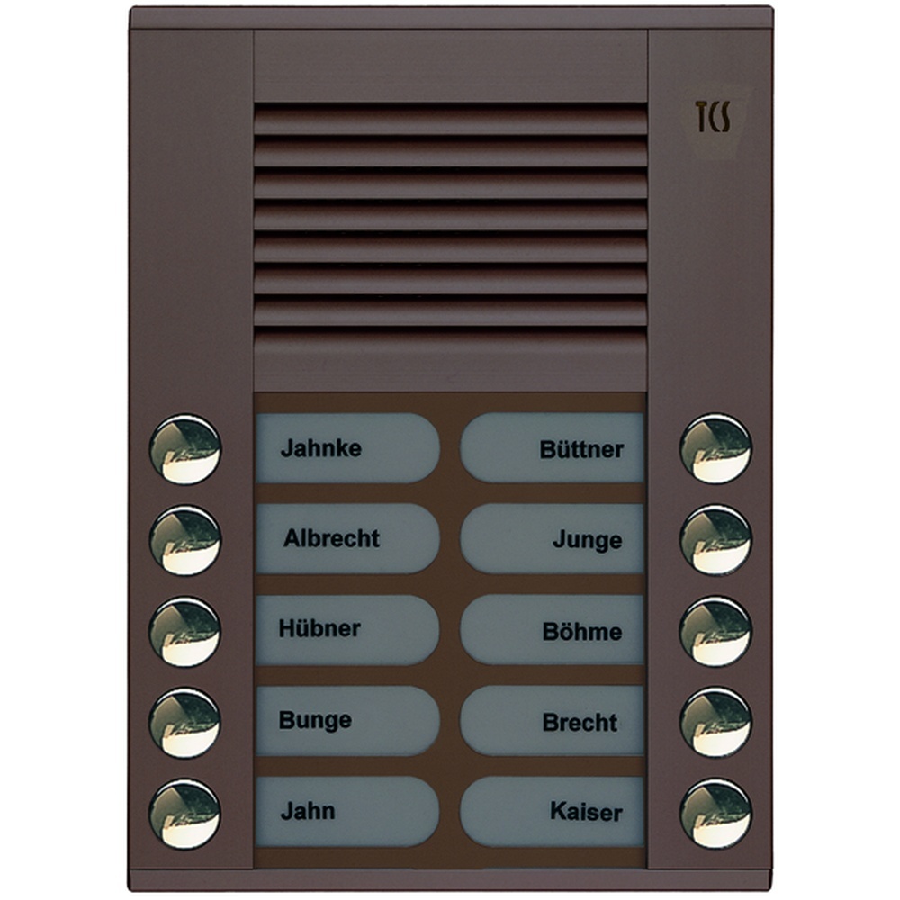 TCS Türstation Audio PES10-EB/04 integrierte Klingeltastenverdrahtung, Metallklingelknöpfe mit vergoldeten und wartungsfreien Tastenkontakten, langlebige Namensschildbeleuchtung durch Leuchtdioden, langlebige Namensschildabdeckung aus 5 mm dickem Kunststoffglas, Namensschildgröße 41x15 mm, beliebige Klingeltaste als Lichtschalttaste nutzbar, Lichtsymbole liegt bei, Kontrollton für den Besucher beim Drücken der Klingeltaste, sehr einfache Montage und Installation, Temperaturbereich: -20 GradC bis +50 GradC, mit Mikrofon, Lautsprecher und Elektronik für einfachen Anschluss an den TCS:BUS, gute Sprachqualität, Lautstärke und Mikrofonempfindlichkeit einstellbar, für den Anschluss weiterer Klingeltastenerweiterungen vorbereitet, Farbe: Aluminium eloxiert bronze, Abmessungen: 185x135x20 mm Hersteller Typ PES10EB04 EAN Nr. 4035138025744 Warengruppe TCS Außenstation