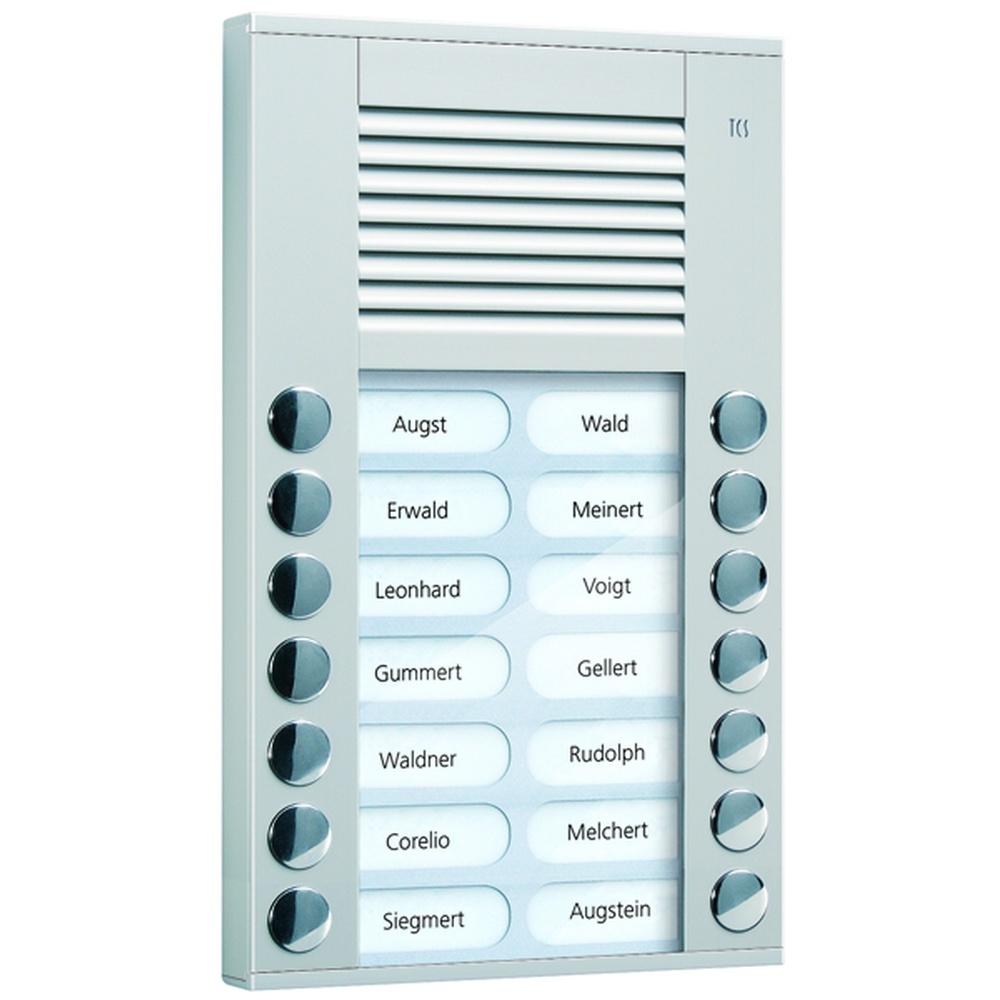 TCS Türstation Audio PES14-EN/04 integrierte Klingeltastenverdrahtung, Metallklingelknöpfe mit vergoldeten und wartungsfreien Tastenkontakten, langlebige Namensschildbeleuchtung durch Leuchtdioden, langlebige Namensschildabdeckung aus 5 mm dickem Kunststoffglas, Namensschildgröße 41x15 mm, beliebige Klingeltaste als Lichtschalttaste nutzbar, Lichtsymbole liegt bei, Kontrollton für den Besucher beim Drücken der Klingeltaste, sehr einfache Montage und Installation, Temperaturbereich: -20 GradC bis +50 GradC, mit Mikrofon, Lautsprecher und Elektronik für einfachen Anschluss an den TCS:BUS, gute Sprachqualität, Lautstärke und Mikrofonempfindlichkeit einstellbar, für den Anschluss weiterer Klingeltastenerweiterungen vorbereitet, Farbe: Aluminium eloxiert natur, Abmessungen: 223x135x20 mm Hersteller Typ PES14EN04 EAN Nr. 4035138025782 Warengruppe TCS Außenstation