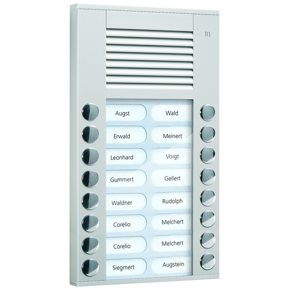 TCS Türstation Audio PES16-EN/04 integrierte Klingeltastenverdrahtung, Metallklingelknöpfe mit vergoldeten und wartungsfreien Tastenkontakten, langlebige Namensschildbeleuchtung durch Leuchtdioden, langlebige Namensschildabdeckung aus 5 mm dickem Kunststoffglas, Namensschildgröße 41x15 mm, beliebige Klingeltaste als Lichtschalttaste nutzbar, Lichtsymbole liegt bei, Kontrollton für den Besucher beim Drücken der Klingeltaste, sehr einfache Montage und Installation, Temperaturbereich: -20 GradC bis +50 GradC, mit Mikrofon, Lautsprecher und Elektronik für einfachen Anschluss an den TCS:BUS, gute Sprachqualität, Lautstärke und Mikrofonempfindlichkeit einstellbar, für den Anschluss weiterer Klingeltastenerweiterungen vorbereitet, Farbe: Aluminium eloxiert natur, Abmessungen: 242x135x20 mm Hersteller Typ PES16EN04 EAN Nr. 4035138025812 Warengruppe TCS Außenstation