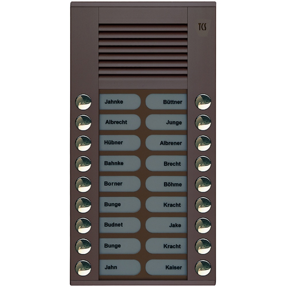 TCS Türstation Audio PES18-EB/04 integrierte Klingeltastenverdrahtung, Metallklingelknöpfe mit vergoldeten und wartungsfreien Tastenkontakten, langlebige Namensschildbeleuchtung durch Leuchtdioden, langlebige Namensschildabdeckung aus 5 mm dickem Kunststoffglas, Namensschildgröße 41x15 mm, beliebige Klingeltaste als Lichtschalttaste nutzbar, Lichtsymbole liegt bei, Kontrollton für den Besucher beim Drücken der Klingeltaste, sehr einfache Montage und Installation, Temperaturbereich: -20 GradC bis +50 GradC, mit Mikrofon, Lautsprecher und Elektronik für einfachen Anschluss an den TCS:BUS, gute Sprachqualität, Lautstärke und Mikrofonempfindlichkeit einstellbar, für den Anschluss weiterer Klingeltastenerweiterungen vorbereitet, Farbe: Aluminium eloxiert bronze, Abmessungen: 261x135x20 mm Hersteller Typ PES18EB04 EAN Nr. 4035138025867 Warengruppe TCS Außenstation