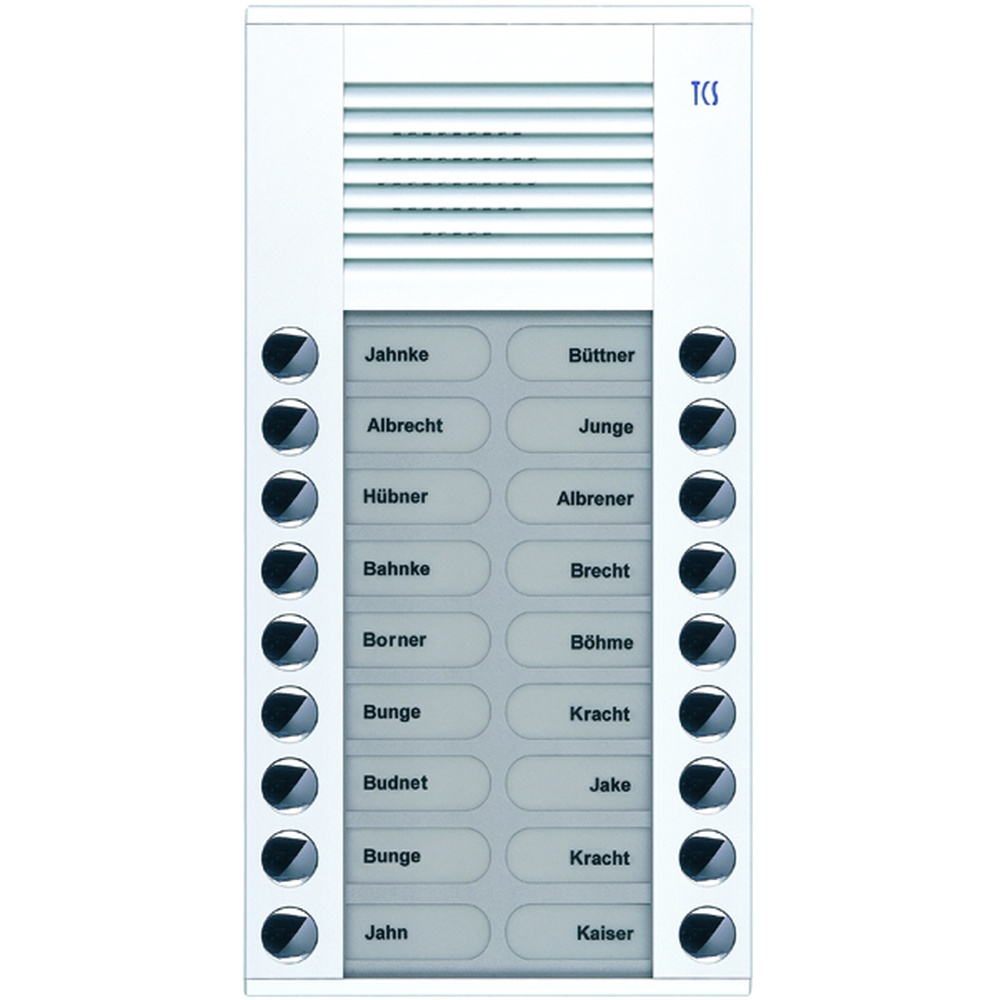 TCS Türstation Audio PES18-WS/04 integrierte Klingeltastenverdrahtung, Metallklingelknöpfe mit vergoldeten und wartungsfreien Tastenkontakten, langlebige Namensschildbeleuchtung durch Leuchtdioden, langlebige Namensschildabdeckung aus 5 mm dickem Kunststoffglas, Namensschildgröße 41x15 mm, beliebige Klingeltaste als Lichtschalttaste nutzbar, Lichtsymbole liegt bei, Kontrollton für den Besucher beim Drücken der Klingeltaste, sehr einfache Montage und Installation, Temperaturbereich: -20 GradC bis +50 GradC, mit Mikrofon, Lautsprecher und Elektronik für einfachen Anschluss an den TCS:BUS, gute Sprachqualität, Lautstärke und Mikrofonempfindlichkeit einstellbar, für den Anschluss weiterer Klingeltastenerweiterungen vorbereitet, Farbe: weiß lackiert, RAL 9010, Abmessungen: 261x135x20 mm Hersteller Typ PES18WS04 EAN Nr. 4035138025850 Warengruppe TCS Außenstation
