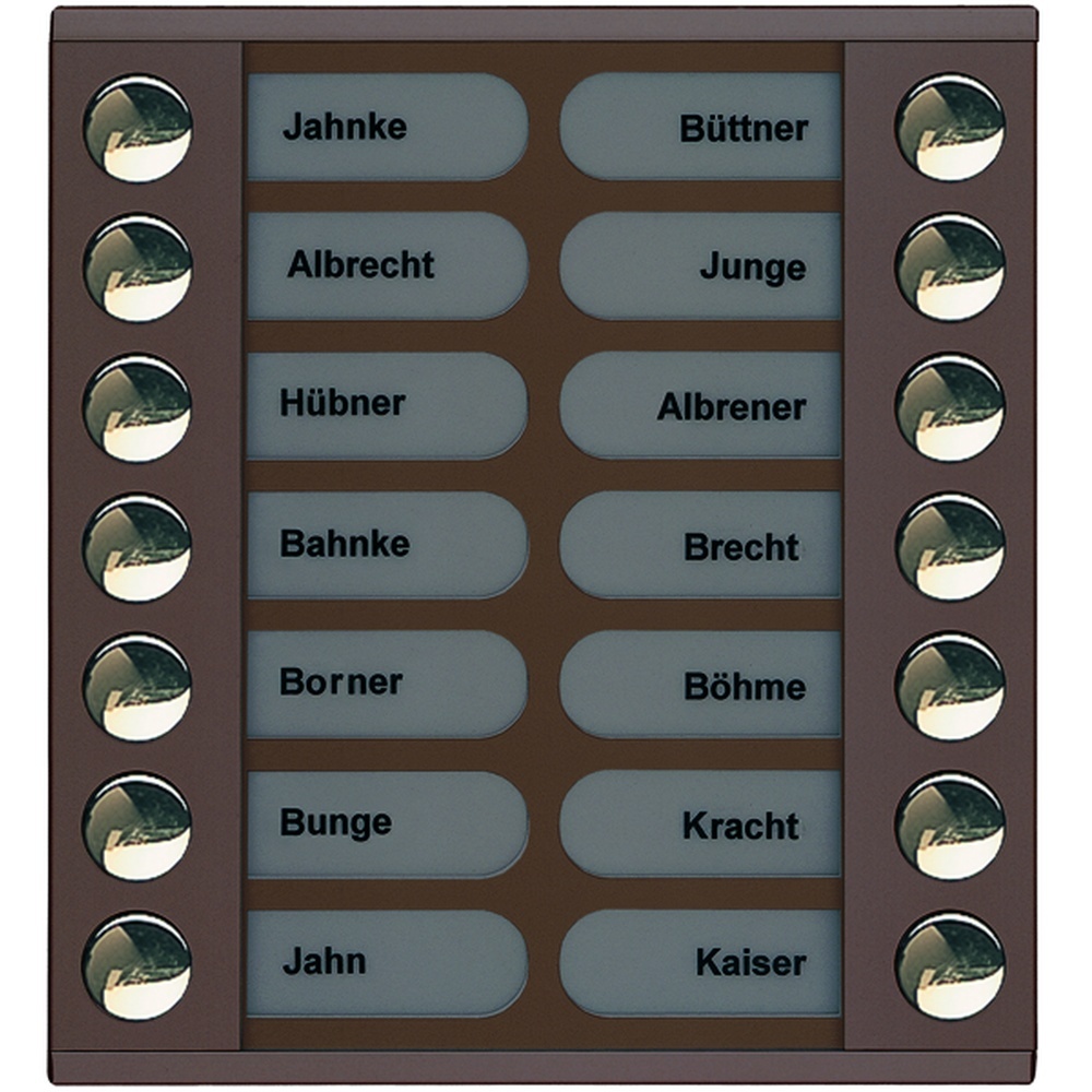 TCS Türstation Audio PET14-EB/04 Integrierte Elektronik- und Klingeltastenverdrahtung, Anschluss über Verbindungsleitung an PES-Außenstation, für den Anschluss weiterer Klingeltastenerweiterungen vorbereitet, Namensschildgröße 41x15 mm, Farbe: Aluminium eloxiert bronze, Abmessungen: 147x135x20 mm Hersteller Typ PET14EB04 EAN Nr. 4035138025324 Warengruppe TCS Außenstation