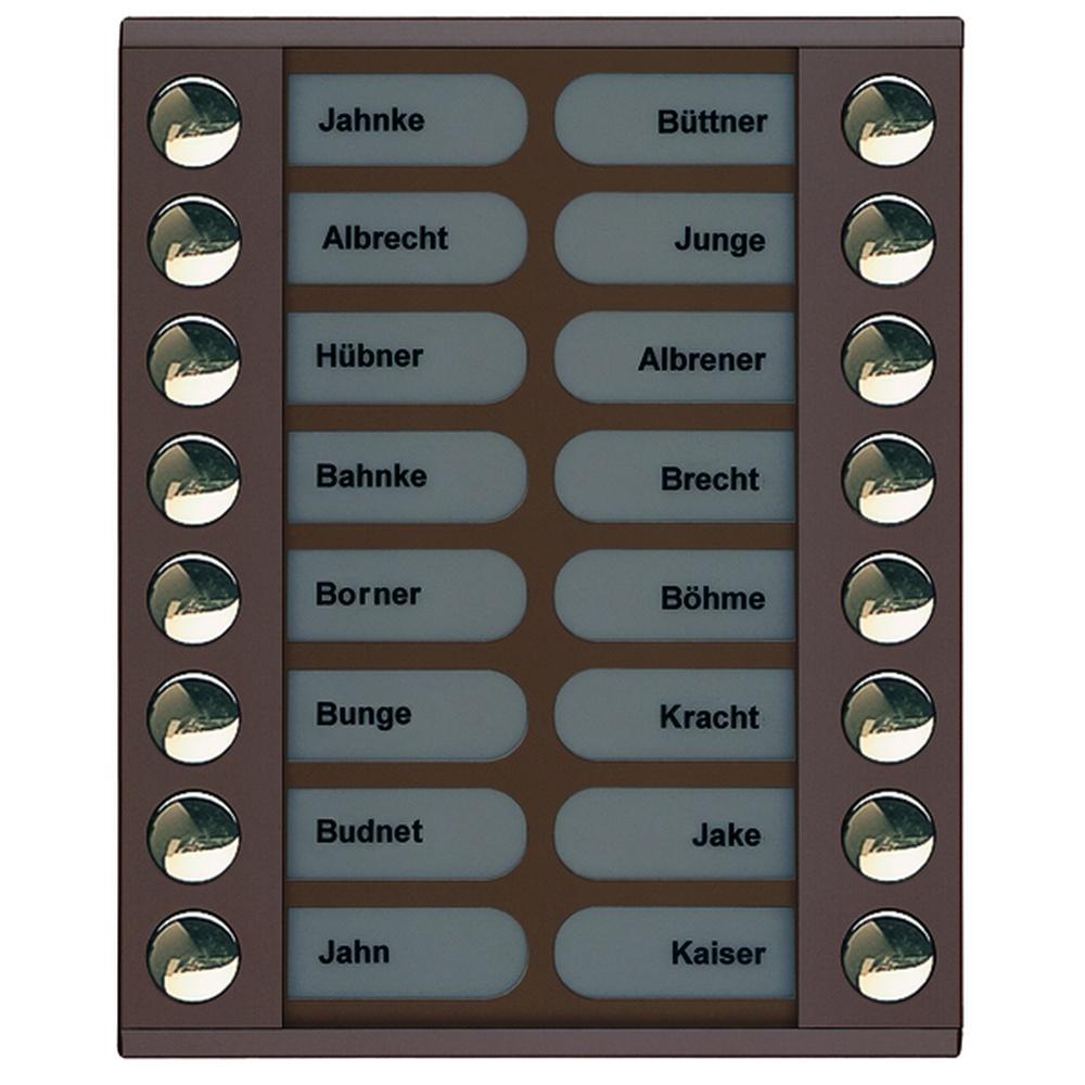 TCS Türstation Audio PET16-EB/04 Integrierte Elektronik- und Klingeltastenverdrahtung, Anschluss über Verbindungsleitung an PES-Außenstation, für den Anschluss weiterer Klingeltastenerweiterungen vorbereitet, Namensschildgröße 41x15 mm, Farbe: Aluminium eloxiert bronze, Abmessungen: 166x135x20 mm Hersteller Typ PET16EB04 EAN Nr. 4035138025355 Warengruppe TCS Außenstation