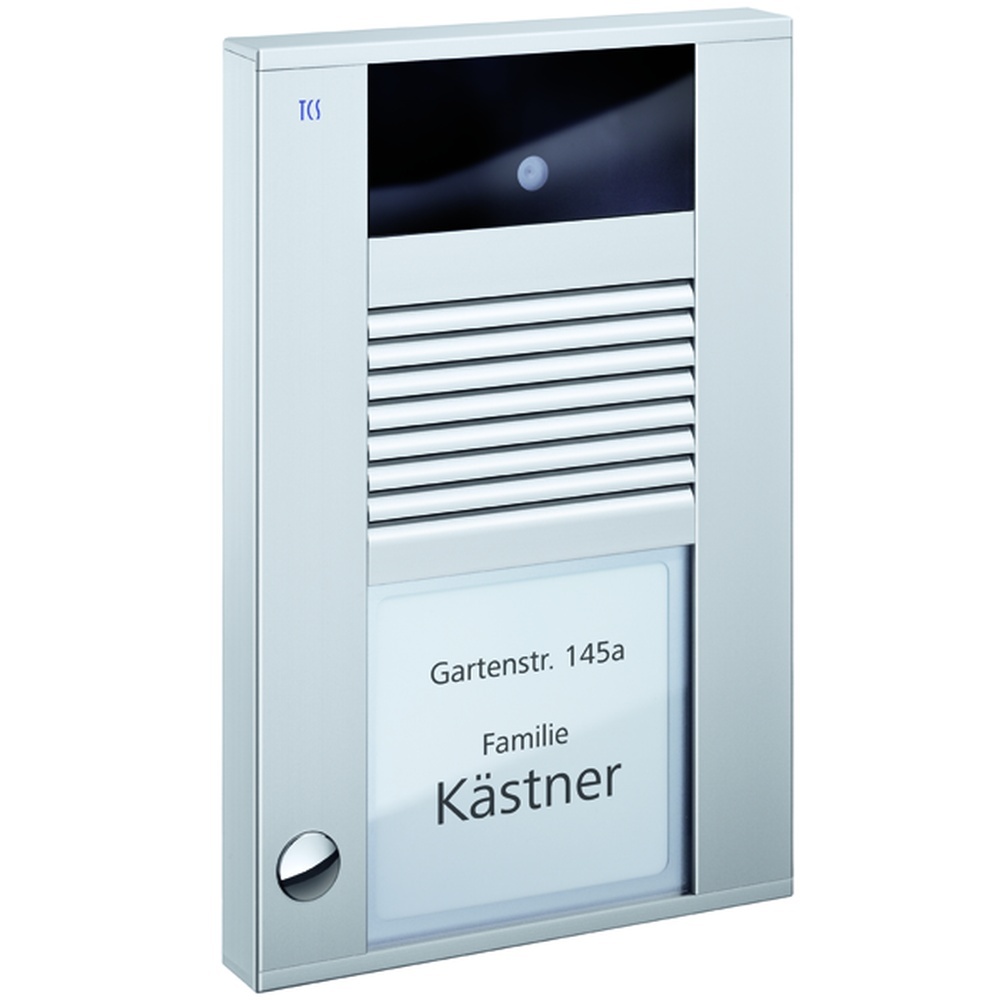 TCS Türstation Video AVD14013-0010 für 1 Wohneinheit, Kamerafeld: H 38 mmxB 82 mm, color-Kamera CMOS-Sensor 380 TVL, IR-Beleuchtung für Nahfeldausleuchtung, automatische Tag/Nachtumschaltung, Brennweite: f = 2,0 mm (F2,5), Lichtempfindlichkeit 0 Lux (IR ON), 1 Lux (IR OFF), diagonaler Erfassungswinkel in 130 Grad, empfohlene Montagehöhe für die Kameraposition 1,6 m, Videoausgang symmetrisch 1 Vss FBAS, basiert auf dem TCS-Videosystem in 6-Draht-Technik, Eingangsstrom: I(a) = 0,4 mA, I(P) = 60 mA in Ruhe, maximaler Eingangsstrom: I(Pmax) = 80 mA, zulässige Umgebungstemperatur: -20 Grad C bis 50 Grad C, Farbe: Aluminium eloxiert natur, Maße: H 204 mmxB 135 mmxT 20 mm Hersteller Typ AVD140130010 EAN Nr. 4035138028943 Warengruppe TCS Außenstation