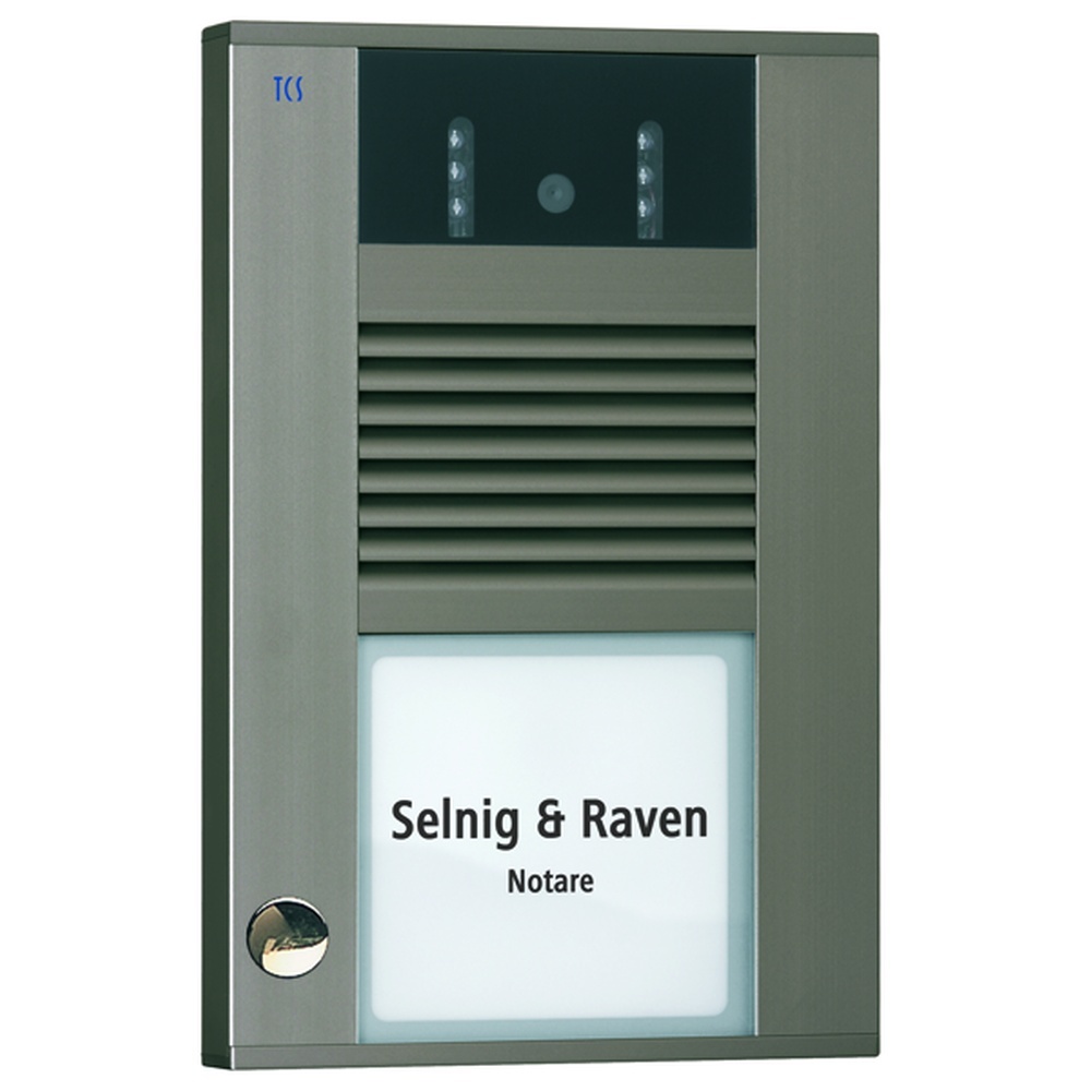 TCS Türstation Video AVD14013-0012 für 1 Wohneinheit, Kamerafeld: H 38 mmxB 82 mm, color-Kamera CMOS-Sensor 380 TVL, IR-Beleuchtung für Nahfeldausleuchtung, automatische Tag/Nachtumschaltung, Brennweite: f = 2,0 mm (F2,5), Lichtempfindlichkeit 0 Lux (IR ON), 1 Lux (IR OFF), diagonaler Erfassungswinkel in 130 Grad, empfohlene Montagehöhe für die Kameraposition 1,6 m, Videoausgang symmetrisch 1 Vss FBAS, basiert auf dem TCS-Videosystem in 6-Draht-Technik, Eingangsstrom: I(a) = 0,4 mA, I(P) = 60 mA in Ruhe, maximaler Eingangsstrom: I(Pmax) = 80 mA, zulässige Umgebungstemperatur: -20 Grad C bis 50 Grad C, Farbe: Aluminium eloxiert bonze, Maße: H 204 mmxB 135 mmxT 20 mm Hersteller Typ AVD140130012 EAN Nr. 4035138028967 Warengruppe TCS Außenstation