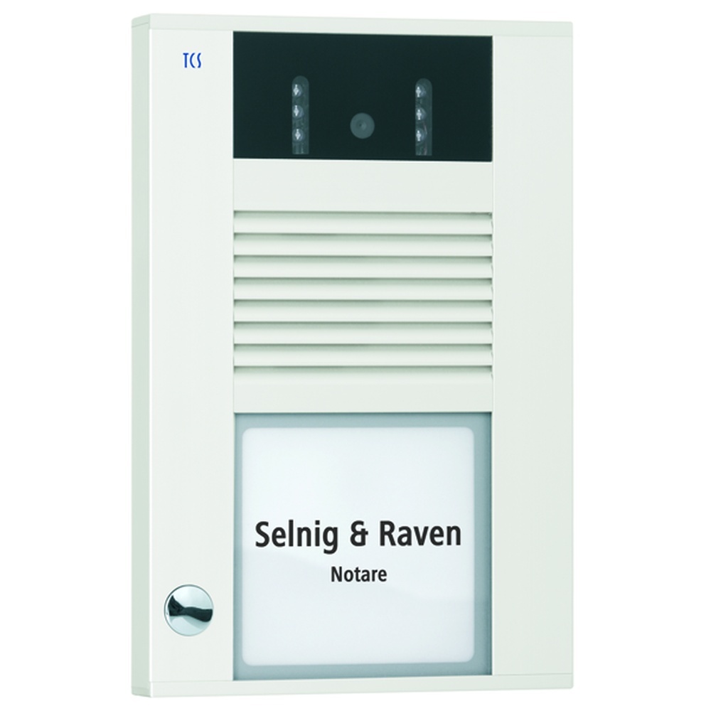 TCS Türstation Video AVD14013-0018 für 1 Wohneinheit, Kamerafeld: H 38 mmxB 82 mm, color-Kamera CMOS-Sensor 380 TVL, IR-Beleuchtung für Nahfeldausleuchtung, automatische Tag/Nachtumschaltung, Brennweite: f = 2,0 mm (F2,5), Lichtempfindlichkeit 0 Lux (IR ON), 1 Lux (IR OFF), diagonaler Erfassungswinkel in 130 Grad, empfohlene Montagehöhe für die Kameraposition 1,6 m, Videoausgang symmetrisch 1 Vss FBAS, basiert auf dem TCS-Videosystem in 6-Draht-Technik, Eingangsstrom: I(a) = 0,4 mA, I(P) = 60 mA in Ruhe, maximaler Eingangsstrom: I(Pmax) = 80 mA, zulässige Umgebungstemperatur: -20 Grad C bis 50 Grad C, Farbe: Aluminium weiß pulverbeschichtet (WS), Maße: H 204 mmxB 135 mmxT 20 mm Hersteller Typ AVD140130018 EAN Nr. 4035138028974 Warengruppe TCS Außenstation