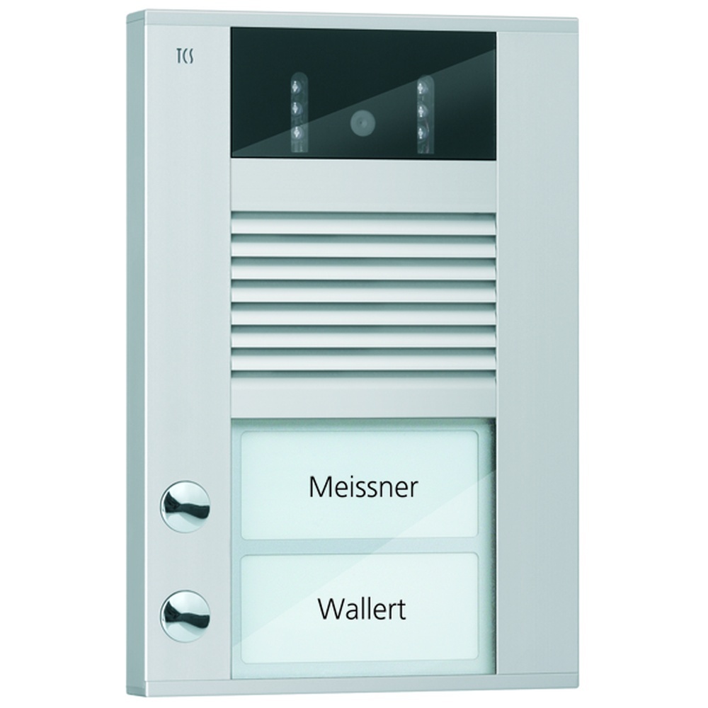 TCS Türstation Video AVD14023-0010 für 2 Wohneinheiten, Kamerafeld: H 38 mmxB 82 mm, color-Kamera CMOS-Sensor 380 TVL, IR-Beleuchtung für Nahfeldausleuchtung, automatische Tag/Nachtumschaltung, Brennweite: f = 2,0 mm (F2,5), Lichtempfindlichkeit 0 Lux (IR ON), 1 Lux (IR OFF), diagonaler Erfassungswinkel in 130 Grad, empfohlene Montagehöhe für die Kameraposition 1,6 m, Videoausgang symmetrisch 1 Vss FBAS, basiert auf dem TCS-Videosystem in 6-Draht-Technik, Eingangsstrom: I(a) = 0,4 mA, I(P) = 60 mA in Ruhe, maximaler Eingangsstrom: I(Pmax) = 80 mA, zulässige Umgebungstemperatur: -20 Grad C bis 50 Grad C, Farbe: Aluminium eloxiert natur, Maße: H 204 mmxB 135 mmxT 20 mm Hersteller Typ AVD140230010 EAN Nr. 4035138028981 Warengruppe TCS Außenstation