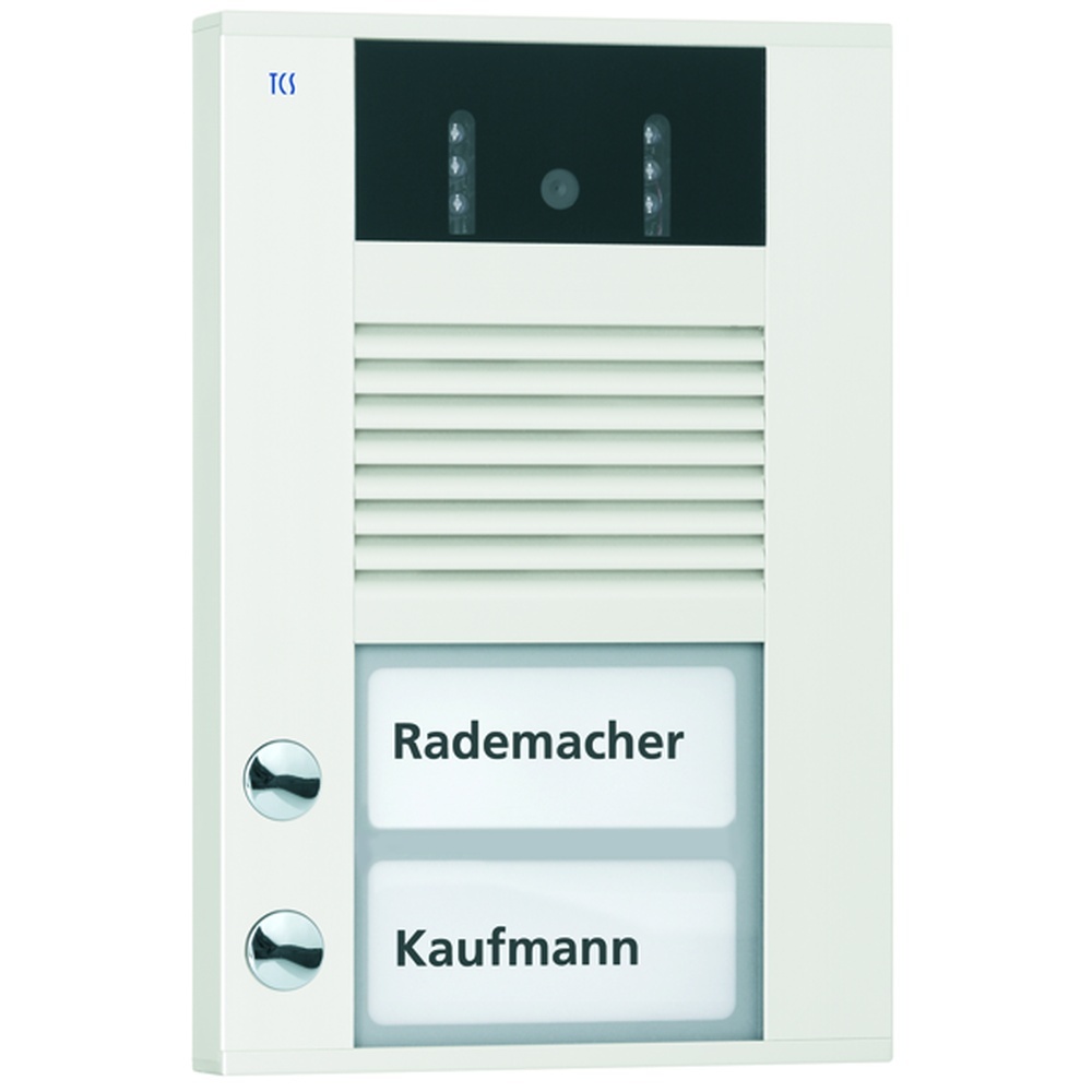 TCS Türstation Video AVD14023-0018 für 2 Wohneinheiten, Kamerafeld: H 38 mmxB 82 mm, color-Kamera CMOS-Sensor 380 TVL, IR-Beleuchtung für Nahfeldausleuchtung, automatische Tag/Nachtumschaltung, Brennweite: f = 2,0 mm (F2,5), Lichtempfindlichkeit 0 Lux (IR ON), 1 Lux (IR OFF), diagonaler Erfassungswinkel in 130 Grad, empfohlene Montagehöhe für die Kameraposition 1,6 m, Videoausgang symmetrisch 1 Vss FBAS, basiert auf dem TCS-Videosystem in 6-Draht-Technik, Eingangsstrom: I(a) = 0,4 mA, I(P) = 60 mA in Ruhe, maximaler Eingangsstrom: I(Pmax) = 80 mA, zulässige Umgebungstemperatur: -20 Grad C bis 50 Grad C, Farbe: Aluminium weiß pulverbeschichtet (WS), Maße: H 242 mmxB 135 mmxT 20 mm Hersteller Typ AVD140230018 EAN Nr. 4035138029018 Warengruppe TCS Außenstation